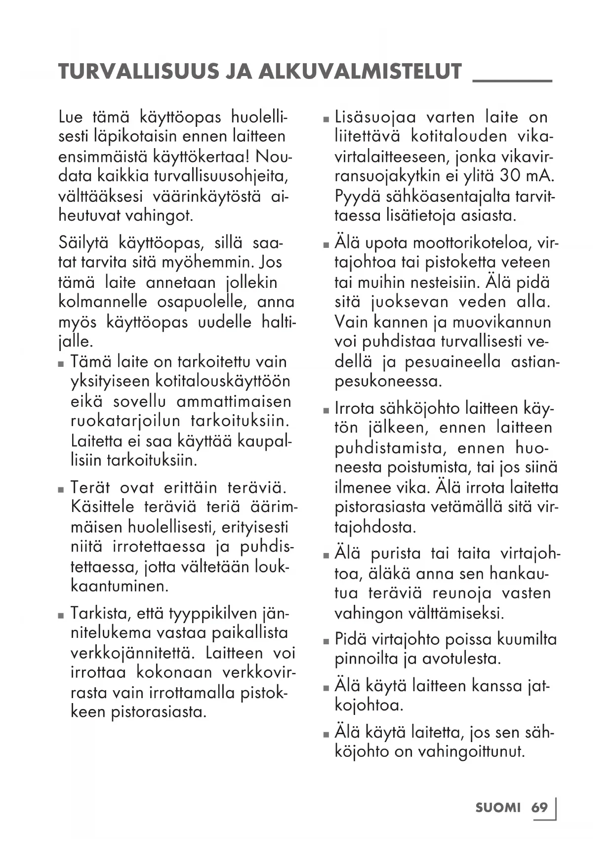 POSTANOWIENIA. Niniejsze warunki gwarancji mają zastosowanie do Urządzeń zakupionych od dnia 25.12.2014 r. Gwarant oświadcza, że niniejsza Gwarancja jest udzielana Użytkownikowi dodatkowo i nie wyłącza, nie ogranicza ani nie zawiesza uprawnień Użytkownika wynikających z przepisów o rękojmi za wady rzeczy sprzedanej na podstawie Kodeksu cywilnego. KARTA GWARANCYJNA ___________________69 SUOMI Lue tämä käyttöopas huolelli- sesti läpikotaisin ennen laitteen ensimmäistä käyttökertaa! Nou- data kaikkia turvallisuusohjeita, välttääksesi väärinkäytöstä ai- heutuvat vahingot. Säilytä käyttöopas, sillä saa- tat tarvita sitä myöhemmin. Jos tämä laite annetaan jollekin kolmannelle osapuolelle, anna myös käyttöopas uudelle halti- jalle.