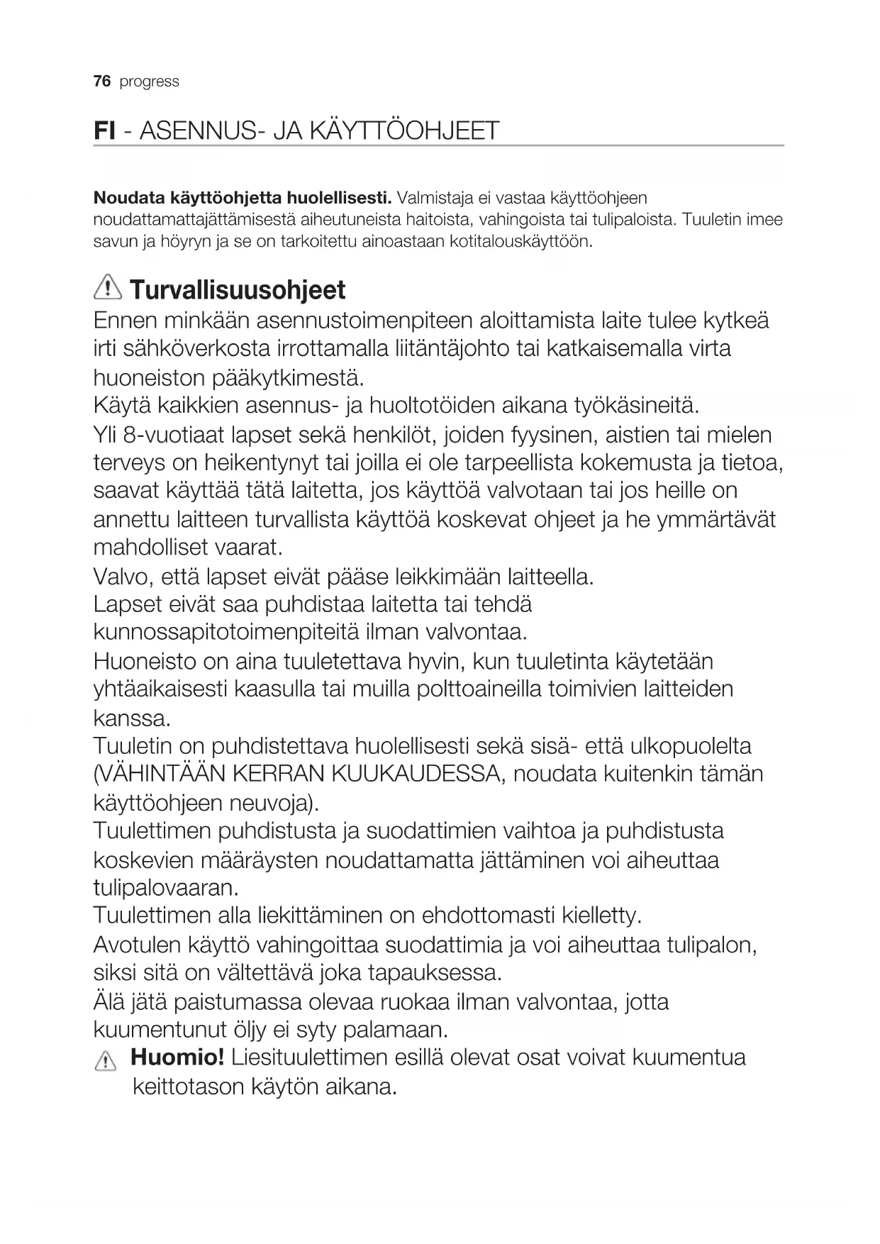 Noudata käyttöohjetta huolellisesti. Valmistaja ei vastaa käyttöohjeen noudattamattajättämisestä aiheutuneista haitoista, vahingoista tai tulipaloista. Tuuletin imee savun ja höyryn ja se on tarkoitettu ainoastaan kotitalouskäyttöön. Turvallisuusohjeet Ennen minkään asennustoimenpiteen aloittamista laite tulee kytkeä irti sähköverkosta irrottamalla liitäntäjohto tai katkaisemalla virta huoneiston pääkytkimestä. Käytä kaikkien asennus ja huoltotöiden aikana työkäsineitä. Yli 8vuotiaat lapset sekä henkilöt, joiden fyysinen, aistien tai mielen terveys on heikentynyt tai joilla ei ole tarpeellista kokemusta ja tietoa, saavat käyttää tätä laitetta, jos käyttöä valvotaan tai jos heille on annettu laitteen turvallista käyttöä koskevat ohjeet ja he ymmärtävät mahdolliset vaarat. Valvo, että lapset eivät pääse leikkimään laitteella. Lapset eivät saa puhdistaa laitetta tai tehdä kunnossapitotoimenpiteitä ilman valvontaa. Huoneisto on aina tuuletettava hyvin, kun tuuletinta käytetään yhtäaikaisesti kaasulla tai muilla polttoaineilla toimivien laitteiden kanssa. Tuuletin on puhdistettava huolellisesti sekä sisä että ulkopuolelta (VÄHINTÄÄN KERRAN KUUKAUDESSA, noudata kuitenkin tämän käyttöohjeen neuvoja). Tuulettimen puhdistusta ja suodattimien vaihtoa ja puhdistusta koskevien määräysten noudattamatta jättäminen voi aiheuttaa tulipalovaaran. Tuulettimen alla liekittäminen on ehdottomasti kielletty. Avotulen käyttö vahingoittaa suodattimia ja voi aiheuttaa tulipalon, siksi sitä on vältettävä joka tapauksessa. Älä jätä paistumassa olevaa ruokaa ilman valvontaa, jotta kuumentunut öljy ei syty palamaan. Huomio! Liesituulettimen esillä olevat osat voivat kuumentua keittotason käytön aikana.progress 77 Turvaohjeet Käytä ainoastaan lamppujen huolto/vaihto ohjeessa ilmoitettuja vaihtolamppuja. Huomio! Älä yhdistä laitetta sähköverkkoon ennenkuin asennus on täysin valmis. Noudata huolellisesti paikallisten viranomaisten antamia savunpoiston teknisiä ja turvatoimenpiteitä koskevia määräyksiä. Poistoilmaa ei saa johtaa kaasulla tai muilla polttoaineilla toimivien laitteiden savunpoistohormiin. Älä käytä liesituuletinta, jos lamppu ei ole paikallaan tai jos lamppuja ei ole asennettu oikein, sillä seurauksena voi olla sähköisku. Älä koskaan käytä tuuletinta, jos sen verkkoa ei ole asennettu oikealla tavalla! Tuuletinta ei saa KOSKAAN käyttää tukipintana, jollei niin ole erikseen mainittu. Käytä vain laitteen mukana tulevia asennukseen tarkoitettuja kiinnitysruuveja, tai hanki oikeanlaisia ruuveja jos ne eivät kuulu varustukseen. Käytä Asennusohjeen mukaisia oikean pituisia ruuveja. Epäselvissä tapauksissa ota yhteys tekniseen tukeen tai vastaavaan asiantuntijaan. Huomio! Kiinnitysruuvien ja –laitteiden ohjeiden vastainen asennus voi vaikuttaa sähköturvallisuuteen. Ympäristönsuojelu Kierrätä materiaalit, jotka on merkitty merkillä . Kierrätä pakkaus laittamalla se asianmukaiseen kierrätysastiaan. Suojele ympäristöä ja ihmisten terveyttä kierrättämällä sähkö ja elektroniikkaromut. Älä hävitä merkillä merkittyjä kodinkoneita kotitalousjätteen mukana. Palauta tuote paikalliseen kierrätyskeskukseen tai ota yhteyttä paikalliseen viranomaiseen. Käyttö Tuuletin on tarkoitettu käytettäväksi joko imukupuversiona ulkoisella poistolla tai suodatinversiona sisäiseen kiertoon. Asennus Verkon jännitteen on oltava sama kuin tuulettimen sisäpuolella olevassa tyyppikilvessä ilmoitettu jännite. Jos laitteessa on pistoke, liitä tuuletin voimassaolevien normien mukaiseen pistorasiaan, joka sijaitsee sellaisessa paikassa, että siihen pääsee käsiksi myös asennuksen jälkeen. Jos laitteessa ei ole pistoketta (suora liitos verkkoon) tai pistoke ei ole sellaisessa paikassa että siihen pääsee käsiksi myös asennuksen jälkeen, käytä normien mukaista kaksinapaista katkaisijaa, jolla varmistetaan että laite saadaan kokonaan irti sähköverkosta, jos ylijännite kategoria on III, asennussääntöjen mukaisesti. Huomio! Tarkista aina, että verkkokaapeli on asennettu oikealla tavalla ennen kuin yhdistät tuulettimen sähköverkkoon ja tarkistat että se toimii oikein.78 progress Lieden keittotason tukipinnan ja keittiötuulettimen alimman osan välinen minimietäisyys on oltava vähintään 45cm sähköliesien osalta ja 55cm kaasu- ja sekaliesien osalta. Jos kaasulieden käyttöohjeissa vaaditaan suurempi etäisyys, on se otettava huomioon. Huolto Huomio! Irroita laite aina virtalähteestä ennen puhdistus tai huoltotoimenpiteitä, irrota virtajohdon pistoke verkkovirtapistorasiasta tai katkaise virta kodin sähköverkosta. Tuuletin on puhdistettava usein sekä sisä etttä ulkopuolelta (vähintään yhtä usein kuin rasvasuodattimien huolto). Käytä puhdistukseen neutraalissa nestemäisessä pesuaineessa kostutettua kangasta. Vältä hankaavia pesuaineita.