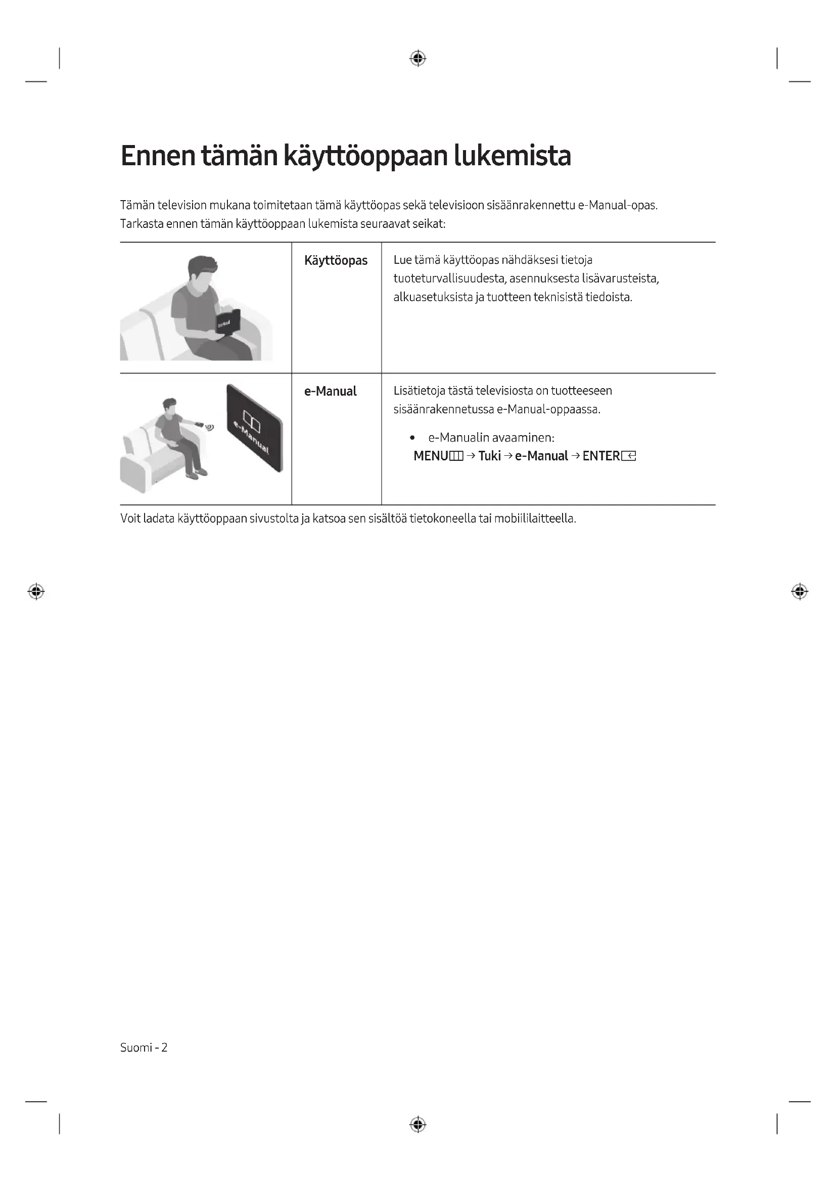 - e-Manualin avaaminen: MENUm → Tuki → e-Manual → ENTERE Voit ladata käyttöoppaan sivustolta ja katsoa sen sisältöä tietokoneella tai mobiililaitteella.Suomi - 2 Suomi - 3 Suomi Varoitus! Tärkeitä turvallisuusohjeita Lue turvallisuusohjeet ennen television käyttöä. HUOMIO LuokanII laite: Tämä merkki tarkoittaa, että laite ei edellytä maadoitusta. SÄHKÖISKUN VAARA. ÄLÄ AVAA.