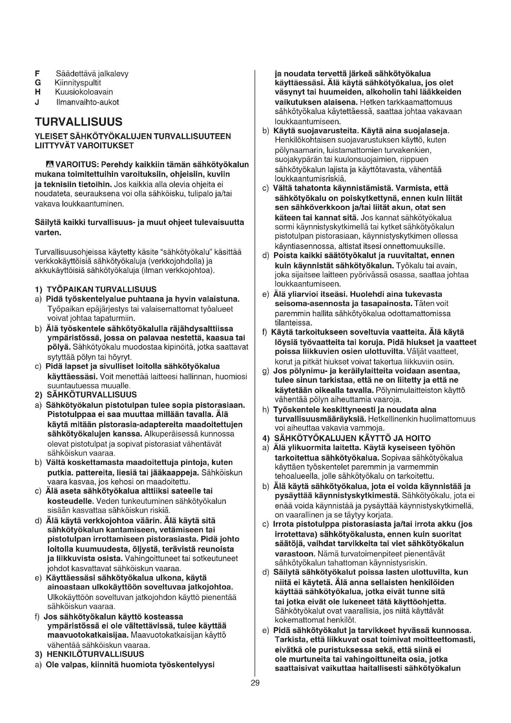 a) Älä ylikuormita laitetta. Käytä kyseiseen työhön tarkoitettua sähkötyökalua. Sopivaa sähkötyökalua käyttäen työskentelet paremmin ja varmemmin tehoalueella, jolle sähkötyökalu on tarkoitettu. b) Älä käytä sähkötyökalua, jota ei voida käynnistää ja pysäyttää käynnistyskytkimestä. Sähkötyökalu, jota ei enää voida käynnistää ja pysäyttää käynnistyskytkimellä, on vaarallinen ja se täytyy korjata. c) Irrota pistotulppa pistorasiasta ja/tai irrota akku (jos irrotettava) sähkötyökalusta, ennen kuin suoritat säätöjä, vaihdat tarvikkeita tai viet sähkötyökalun varastoon. Nämä turvatoimenpiteet pienentävät sähkötyökalun tahattoman käynnistysriskin. d) Säilytä sähkötyökalut poissa lasten ulottuvilta, kun niitä ei käytetä. Älä anna sellaisten henkilöiden käyttää sähkötyökalua, jotka eivät tunne sitä tai jotka eivät ole lukeneet tätä käyttöohjetta. Sähkötyökalut ovat vaarallisia, jos niitä käyttävät kokemattomat henkilöt. e) Pidä sähkötyökalut ja tarvikkeet hyvässä kunnossa. Tarkista, että liikkuvat osat toimivat moitteettomasti, eivätkä ole puristuksessa sekä, että siinä ei ole murtuneita tai vahingoittuneita osia, jotka saattaisivat vaikuttaa haitallisesti sähkötyökalun F Säädettävä jalkalevy G Kiinnityspultit H Kuusiokoloavain J Ilmanvaihto-aukot TURVALLISUUS