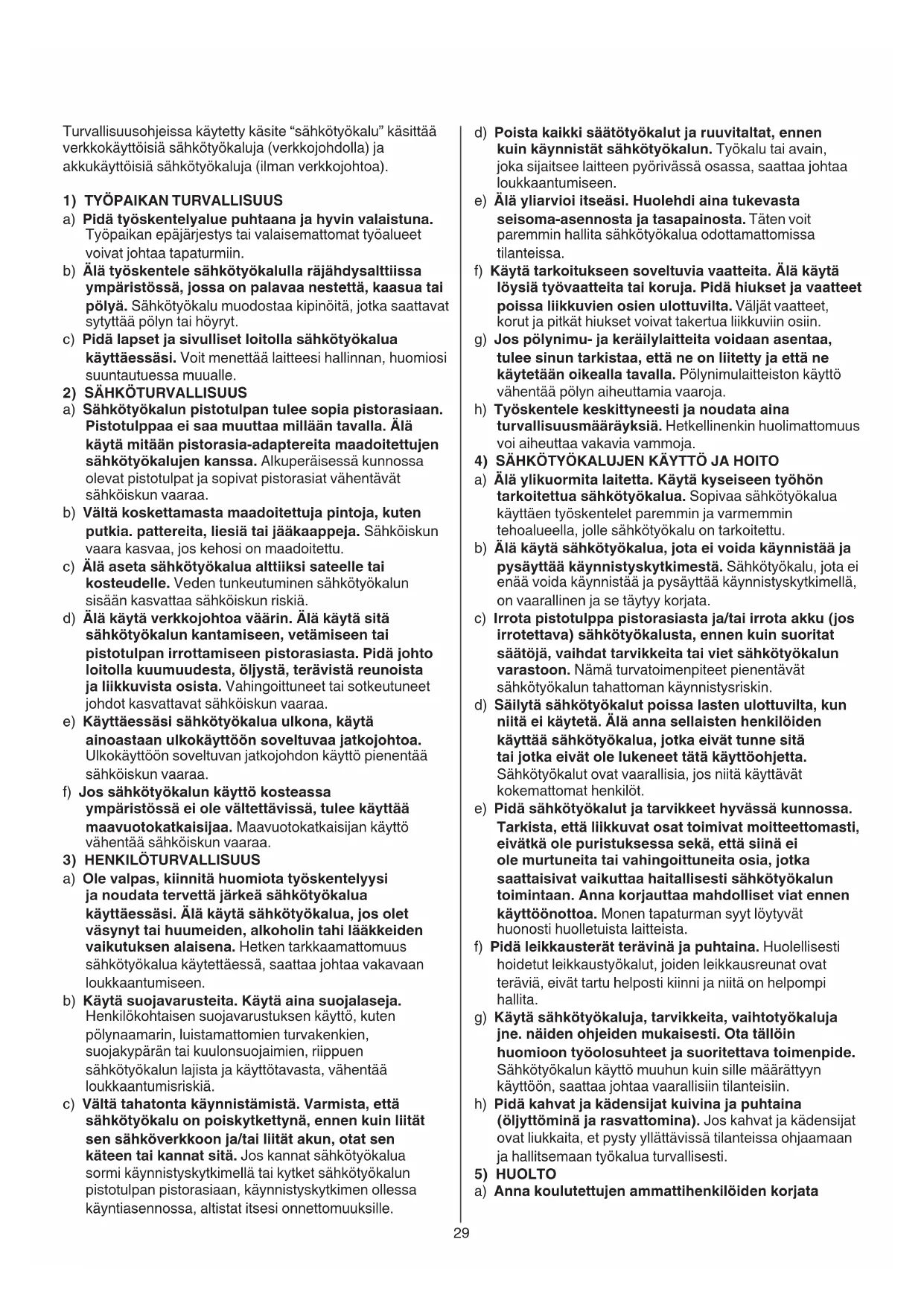 a) Anna koulutettujen ammattihenkilöiden korjata Turvallisuusohjeissa käytetty käsite “sähkötyökalu” käsittää verkkokäyttöisiä sähkötyökaluja (verkkojohdolla) ja akkukäyttöisiä sähkötyökaluja (ilman verkkojohtoa).
