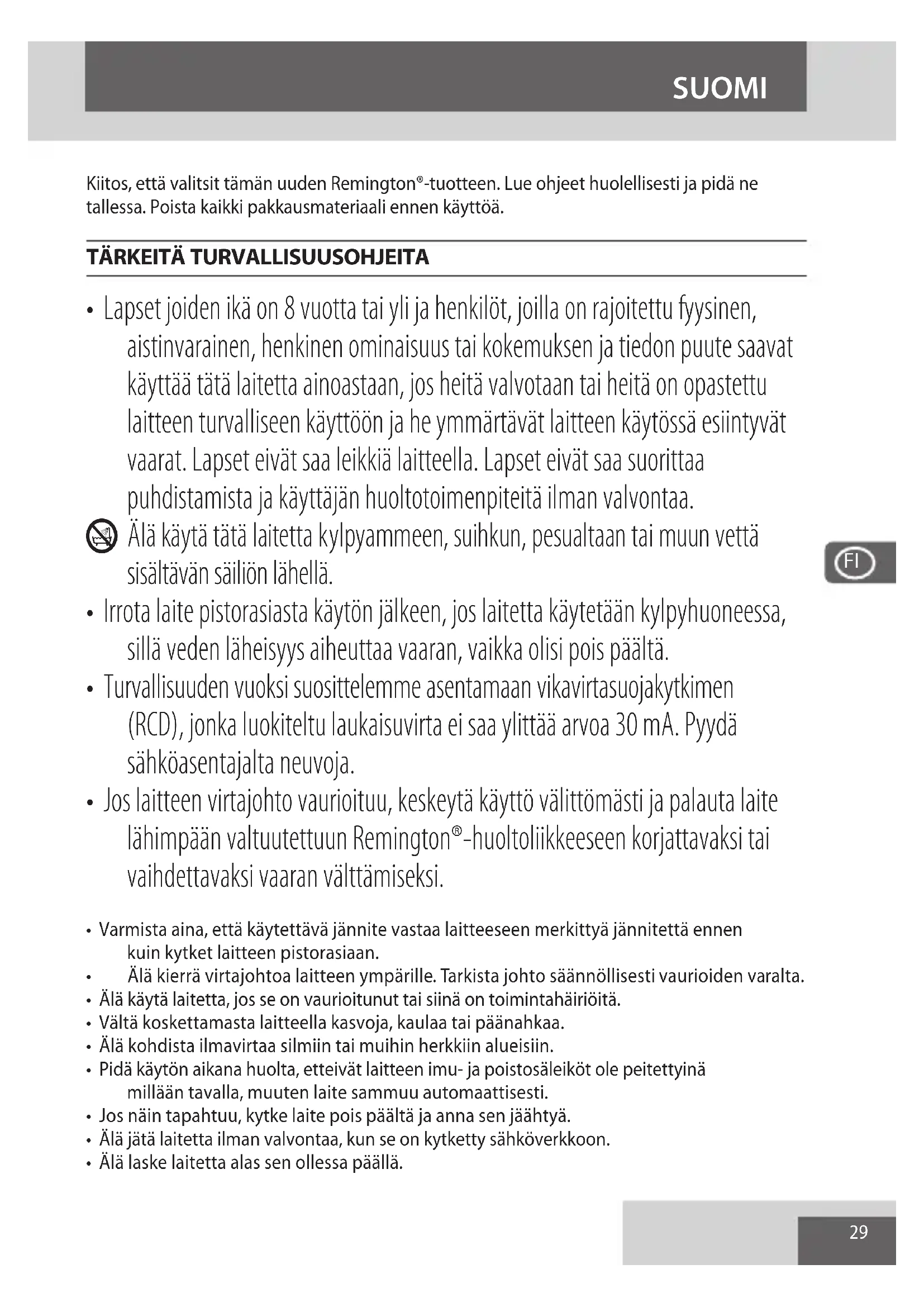 - Jos laitteen virtajohto vaurioituu, keskeytä käyttö välittömästi ja palauta laite lähimpään valtuutettuun Remington®-huoltoliikkeeseen korjattavaksi tai vaihdettavaksi vaaran välttämiseksi.