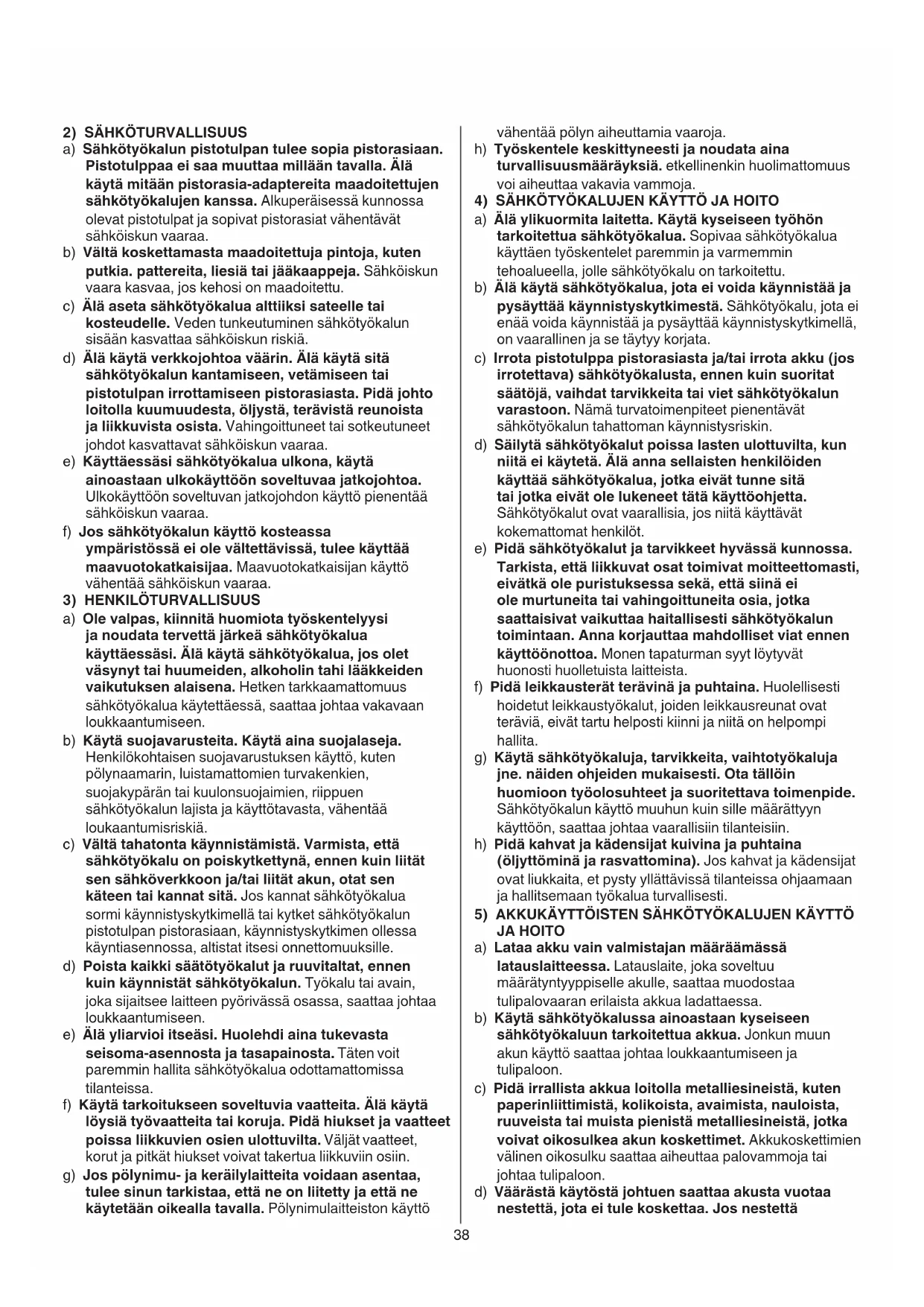 VAROITUS Lue kaikki tämän sähkötyökalun mukana toimitetut varoitukset, ohjeet, kuvat ja tekniset tiedot. Alla mainittujen ohjeiden noudattamisen laiminlyönti saattaa aiheuttaa sähköiskun, tulipalon ja/tai vakavan loukkaantumisen. Säilytä kaikki turvallisuus- ja muut ohjeet tulevaisuutta varten. Turvallisuusohjeissa käytetty käsite "sähkötyökalu" käsittää verkkokäyttöisiä sähkötyökaluja (verkkojohdolla) ja akkukäyttöisiä sähkötyökaluja (ilman verkkojohtoa).