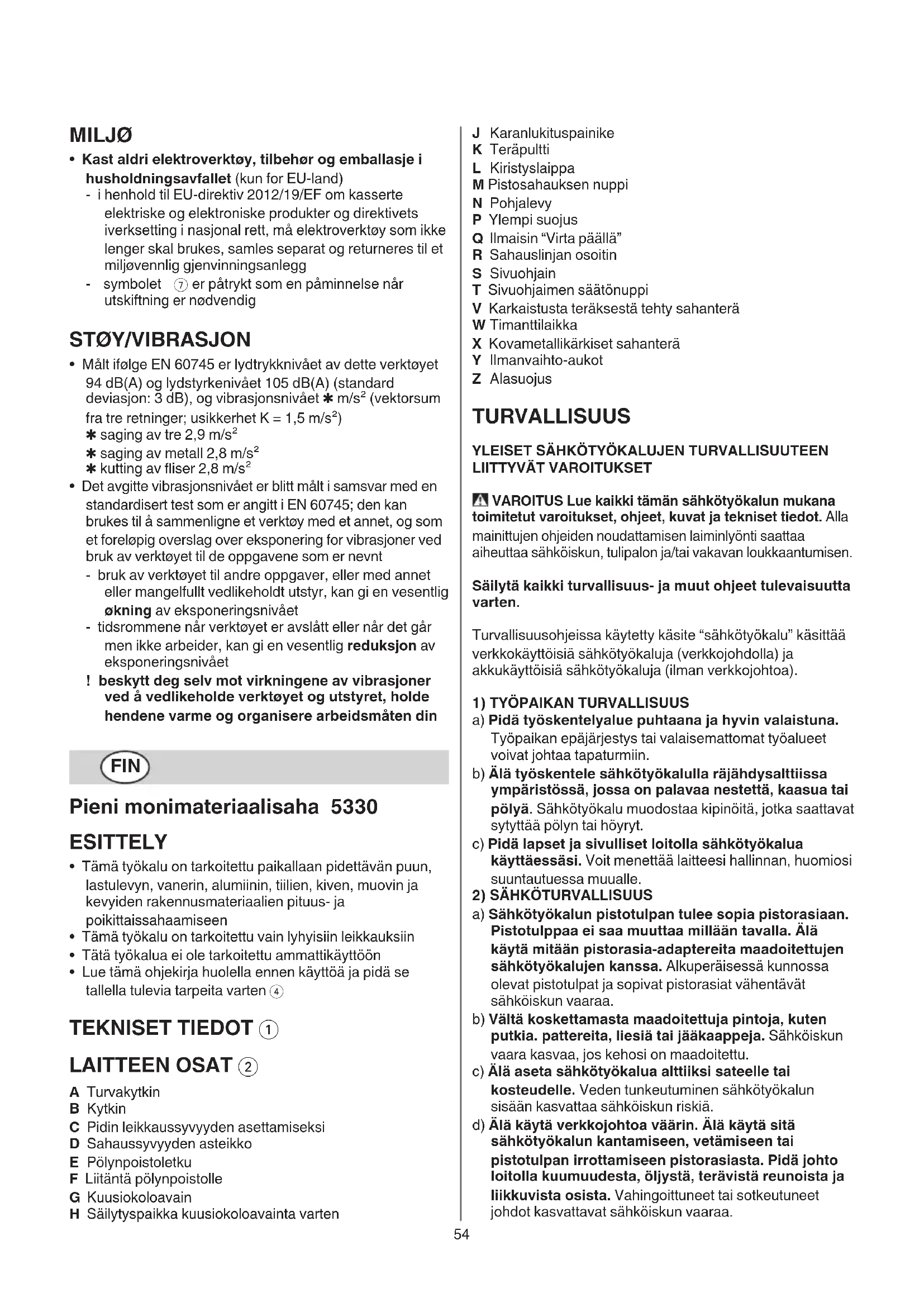 - Mitattuna EN 60745 mukaan työkalun melutaso on 94 dB(A) ja yleensä työkalun äänen voimakkuus on 105 dB(A) (keskihajonta: 3 dB), ja tärinän voimakkuus ✱ m/s² (kolmen suunnan vektorisumma; epävarmuus K = 1,5 m/s²) ✱ puun sahaus 2,9 m/s² ✱ metallin sahaus 2,8 m/s² ✱ laattojen katkaisu 2,8 m/s²