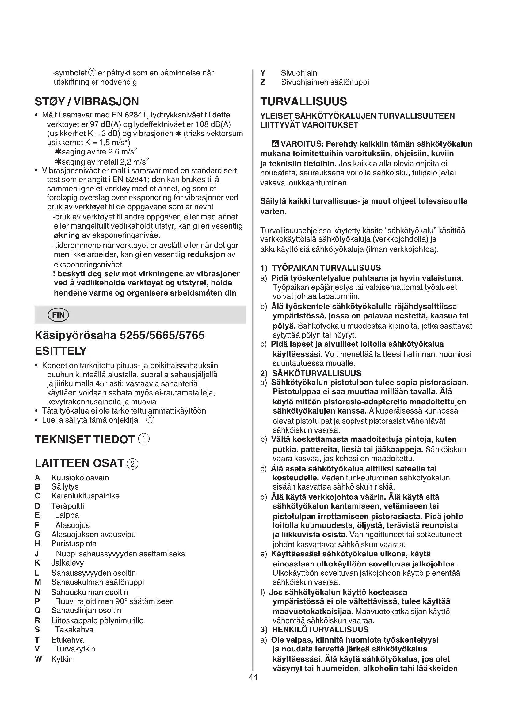 - VAROITUS: Perehdy kaikkiin tämän sähkötyökalun mukana toimitettuihin varoituksiin, ohjeisiin, kuviin ja teknisiin tietoihin. Jos kaikkia alla olevia ohjeita ei noudateta, seurauksena voi olla sähköisku, tulipalo ja/tai vakava loukkaantuminen. Säilytä kaikki turvallisuus- ja muut ohjeet tulevaisuutta varten. Turvallisuusohjeissa käytetty käsite “sähkötyökalu” käsittää verkkokäyttöisiä sähkötyökaluja (verkkojohdolla) ja akkukäyttöisiä sähkötyökaluja (ilman verkkojohtoa).