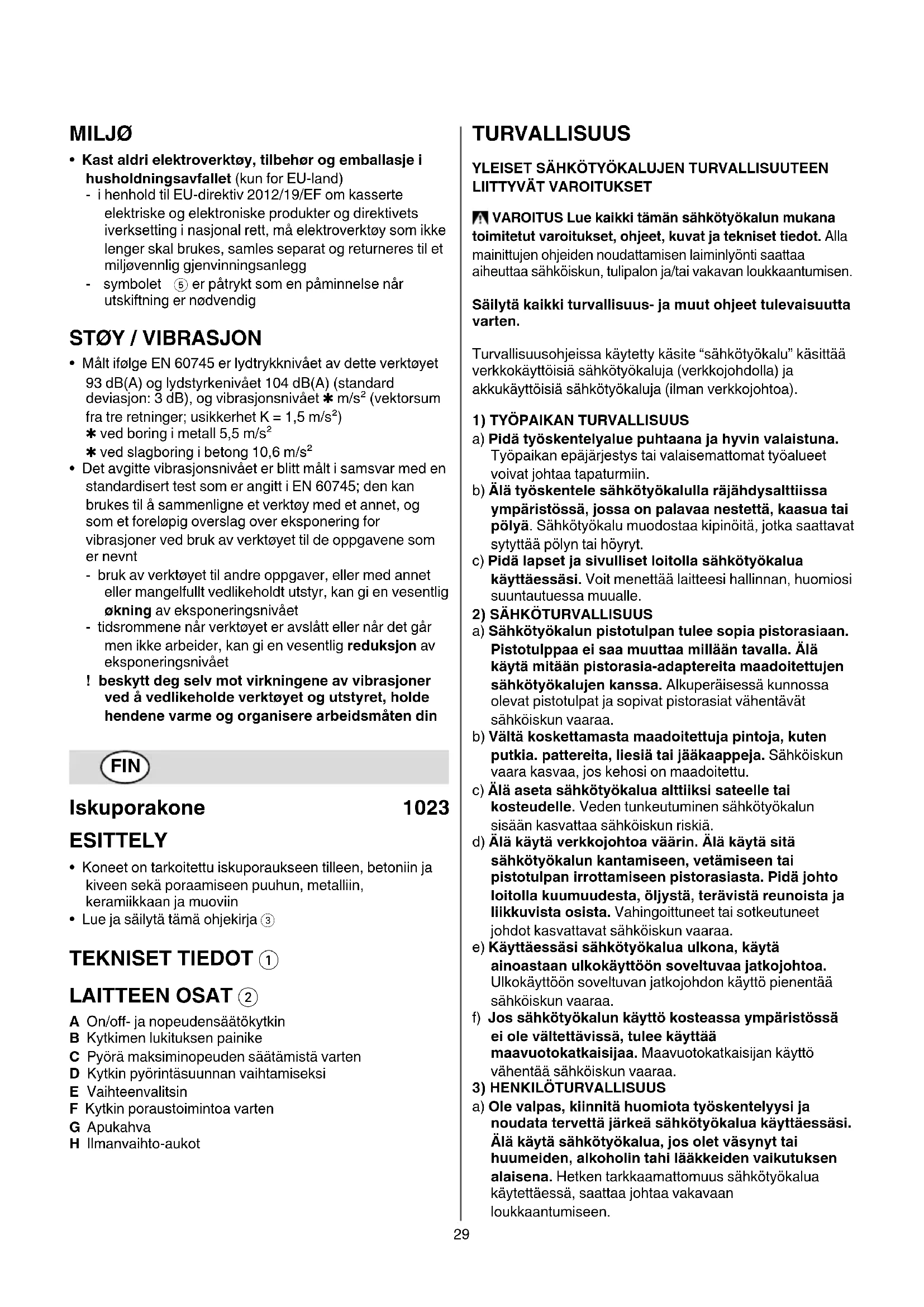 - Lue ja säilytä tämä ohjekirja 3 TEKNISET TIEDOT 1 LAITTEEN OSAT 2 A On/o- ja nopeudensäätökytkin B Kytkimen lukituksen painike C Pyörä maksiminopeuden säätämistä varten D Kytkin pyörintäsuunnan vaihtamiseksi E Vaihteenvalitsin F Kytkin poraustoimintoa varten G Apukahva H Ilmanvaihto-aukot TURVALLISUUS