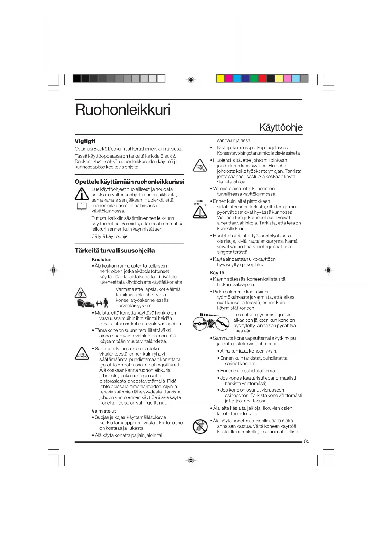 - Älä käytä konetta sateisella säällä äläkä anna sen kastua. Vältä koneen käyttöä kostealla nurmikolla, jos vain mahdollista.66