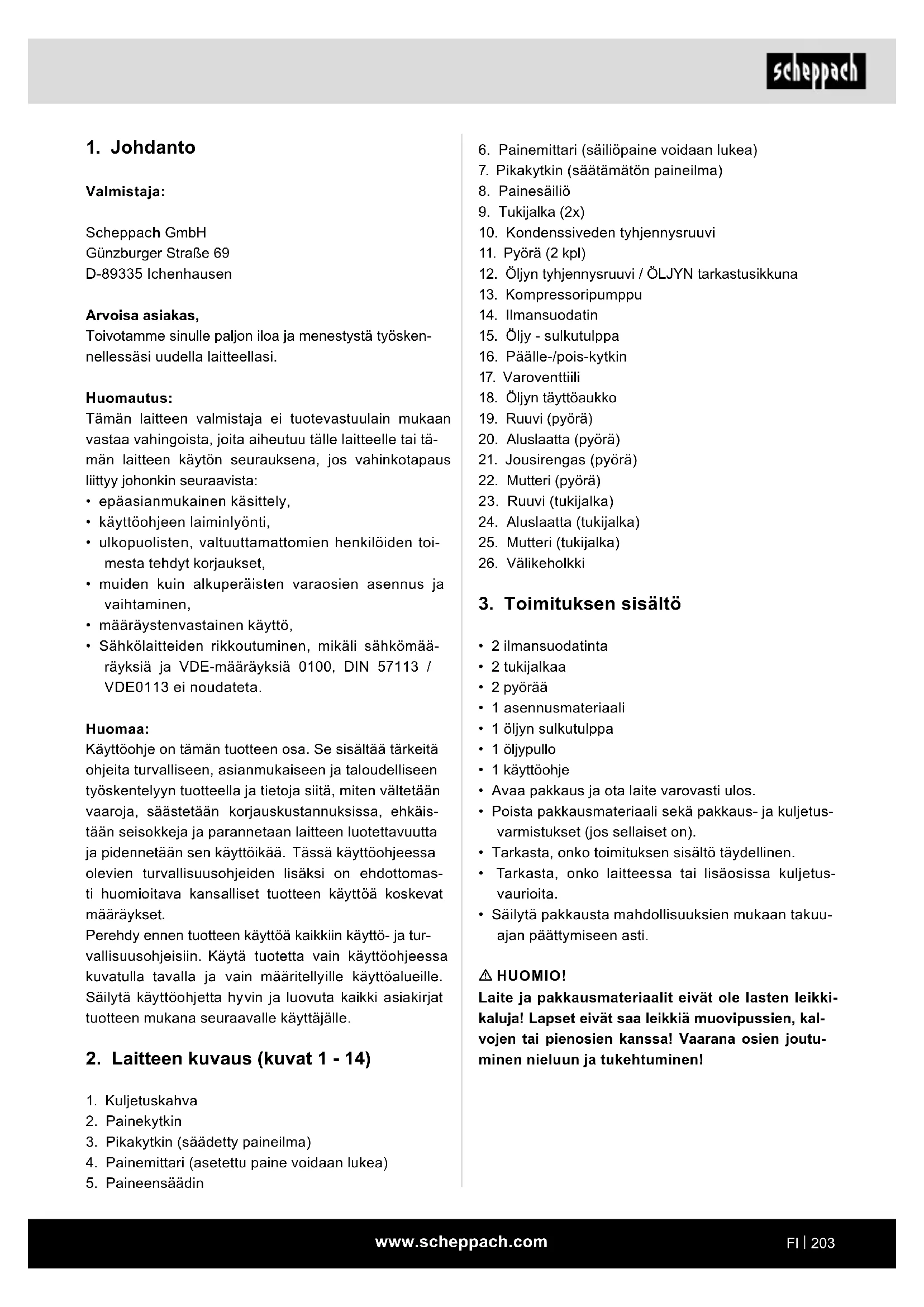 Valmistaja: Scheppach GmbH Günzburger Straße 69 D-89335 Ichenhausen Arvoisa asiakas, Toivotamme sinulle paljon iloa ja menestystä työsken- nellessäsi uudella laitteellasi. Huomautus: Tämän laitteen valmistaja ei tuotevastuulain mukaan vastaa vahingoista, joita aiheutuu tälle laitteelle tai tä- män laitteen käytön seurauksena, jos vahinkotapaus liittyy johonkin seuraavista: