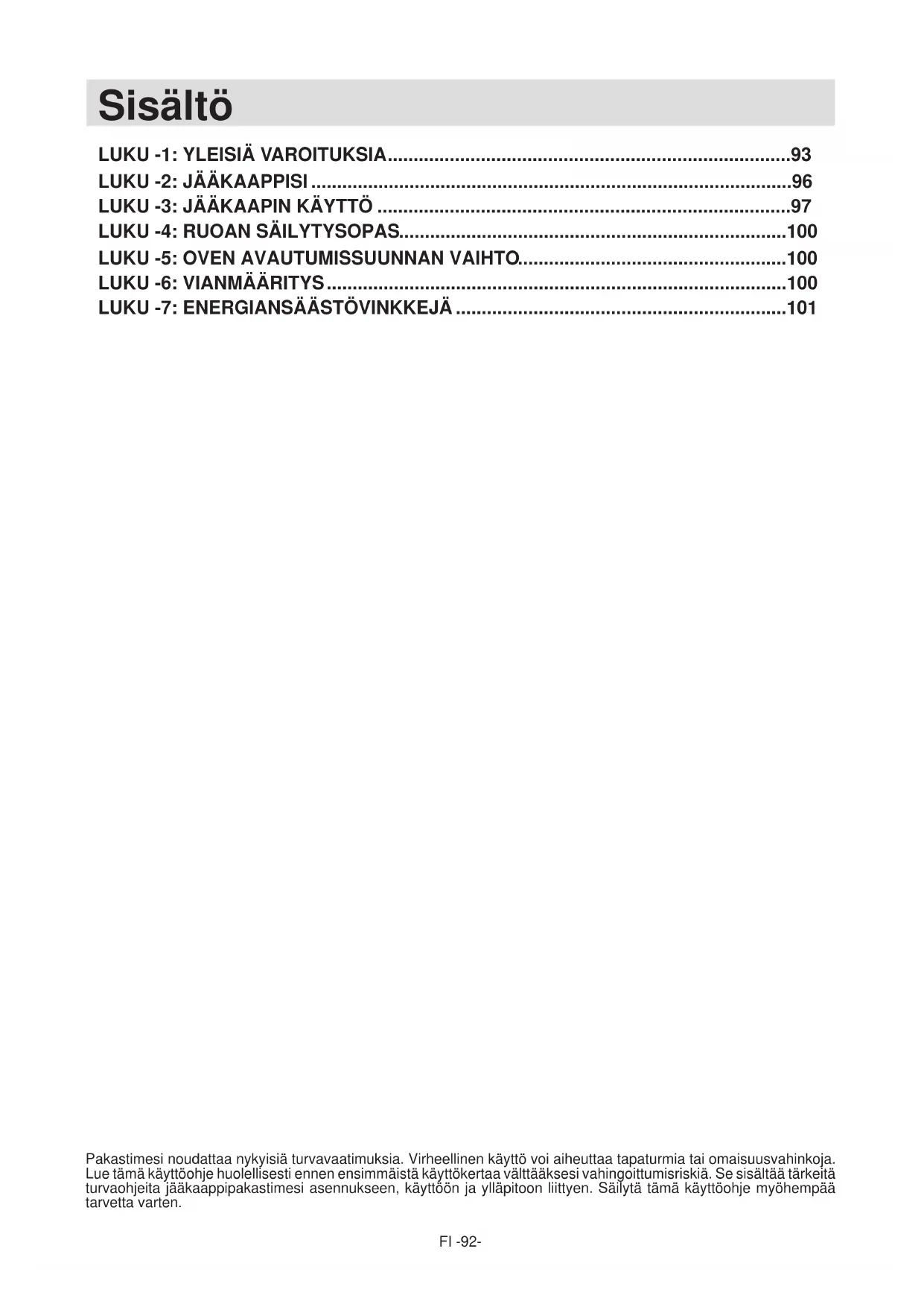 - Enheten är utformad i överensstämmelse med IEC60335-1 / IEC60335-2-24, 2004/108/EG.FI -92- Pakastimesi noudattaa nykyisiä turvavaatimuksia. Virheellinen käyttö voi aiheuttaa tapaturmia tai omaisuusvahinkoja. Lue tämä käyttöohje huolellisesti ennen ensimmäistä käyttökertaa välttääksesi vahingoittumisriskiä. Se sisältää tärkeitä turvaohjeita jääkaappipakastimesi asennukseen, käyttöön ja ylläpitoon liittyen. Säilytä tämä käyttöohje myöhempää tarvetta varten. Sisältö