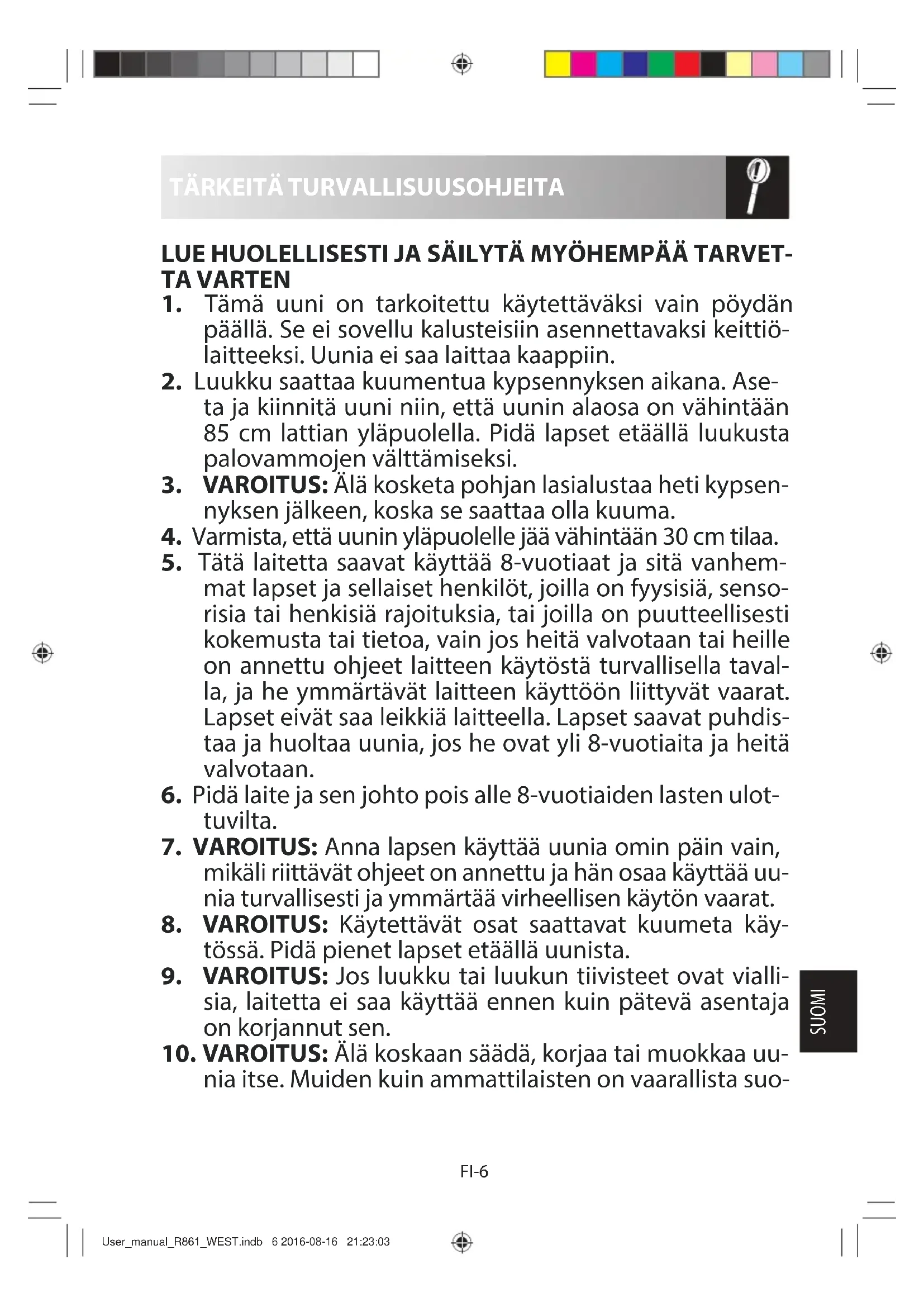 ehkäisemiseksi on aina käytettävä paksuja uunikintaita. Varmista ennen puhdistusta, että alueet eivät ole kuu- mia. Kun kuumennat ruokaa muovi- tai paperiastioissa, pidä uunia silmällä mahdollisen syttymisen varalta. User_manual_R861_WEST.indb 7 2016-08-16 21:23:03FI-8 SUOMI