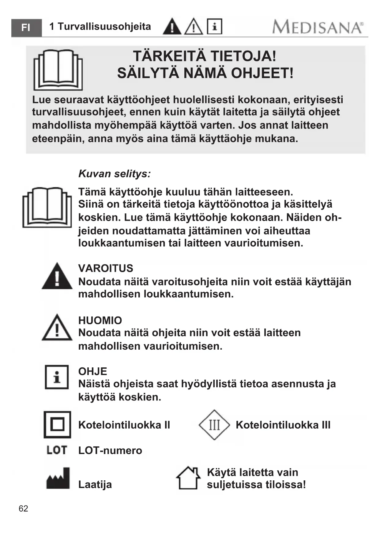 Kotelointiluokka II Kotelointiluokka III Käytä laitetta vain suljetuissa tiloissa!63 1 Turvallisuusohjeita