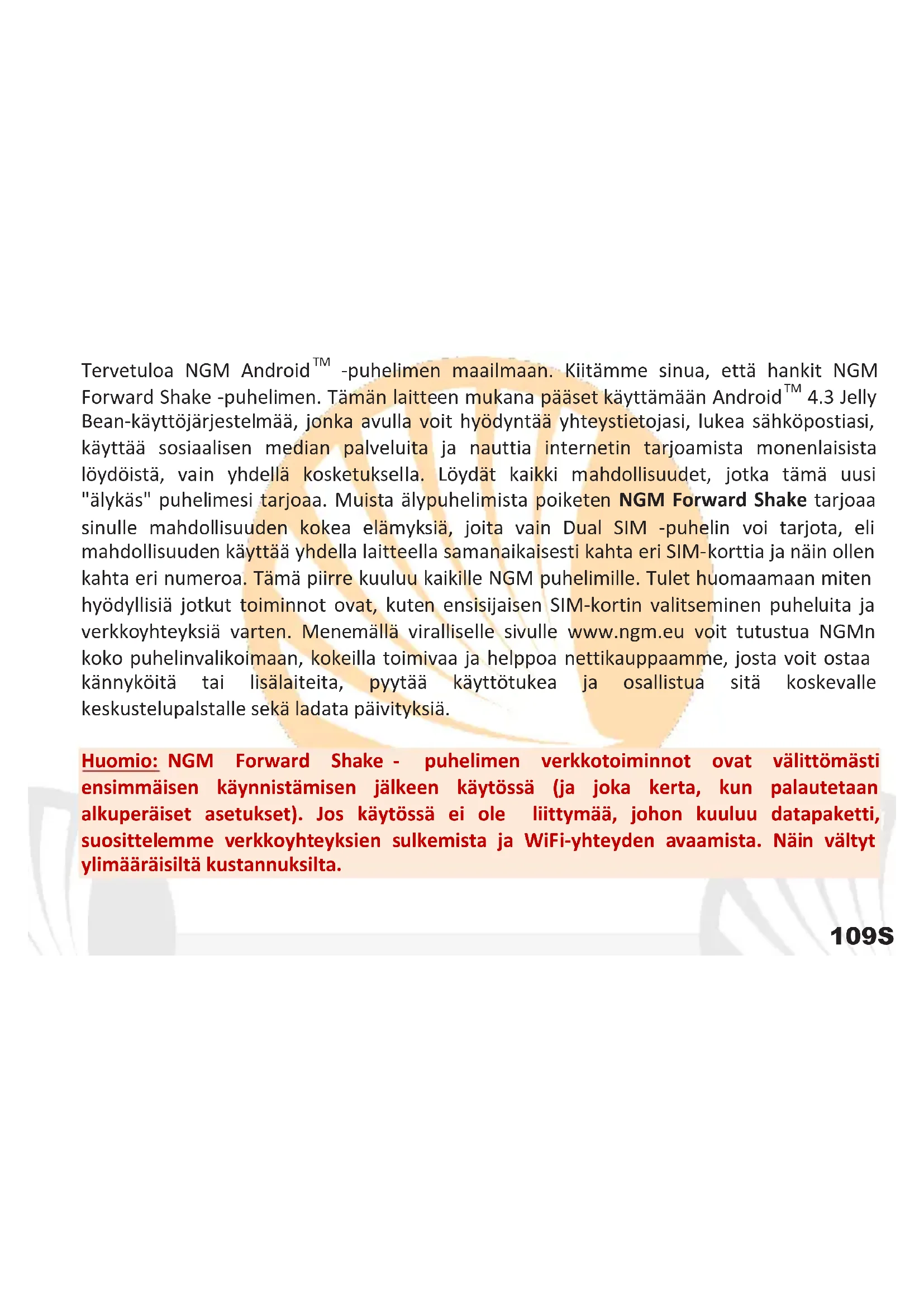 Bean-käyttöjärjestelmää, jonka avulla voit hyödyntää yhteystietojasi, lukea sähköpostiasi, käyttää sosiaalisen median palveluita ja nauttia internetin tarjoamista monenlaisista löydöistä, vain yhdellä kosketuksella. Löydät kaikki mahdollisuudet, jotka tämä uusi "älykäs" puhelimesi tarjoaa. Muista älypuhelimista poiketen NGM Forward Shake tarjoaa sinulle mahdollisuuden kokea elämyksiä, joita vain Dual SIM -puhelin voi tarjota, eli mahdollisuuden käyttää yhdella laitteella samanaikaisesti kahta eri SIM-korttia ja näin ollen kahta eri numeroa. Tämä piirre kuuluu kaikille NGM puhelimille. Tulet huomaamaan miten hyödyllisiä jotkut toiminnot ovat, kuten ensisijaisen SIM-kortin valitseminen puheluita ja verkkoyhteyksiä varten. Menemällä viralliselle sivulle www.ngm.eu voit tutustua NGMn koko puhelinvalikoimaan, kokeilla toimivaa ja helppoa nettikauppaamme, josta voit ostaa kännyköitä tai lisälaiteita, pyytää käyttötukea ja osallistua sitä koskevalle keskustelupalstalle sekä ladata päivityksiä. Huomio: NGM Forward Shake - puhelimen verkkotoiminnot ovat välittömästi ensimmäisen käynnistämisen jälkeen käytössä (ja joka kerta, kun palautetaan alkuperäiset asetukset). Jos käytössä ei ole liittymää, johon kuuluu datapaketti, suosittelemme verkkoyhteyksien sulkemista ja WiFi-yhteyden avaamista. Näin vältyt ylimääräisiltä kustannuksilta.110 SUOMI Käytön aloitus