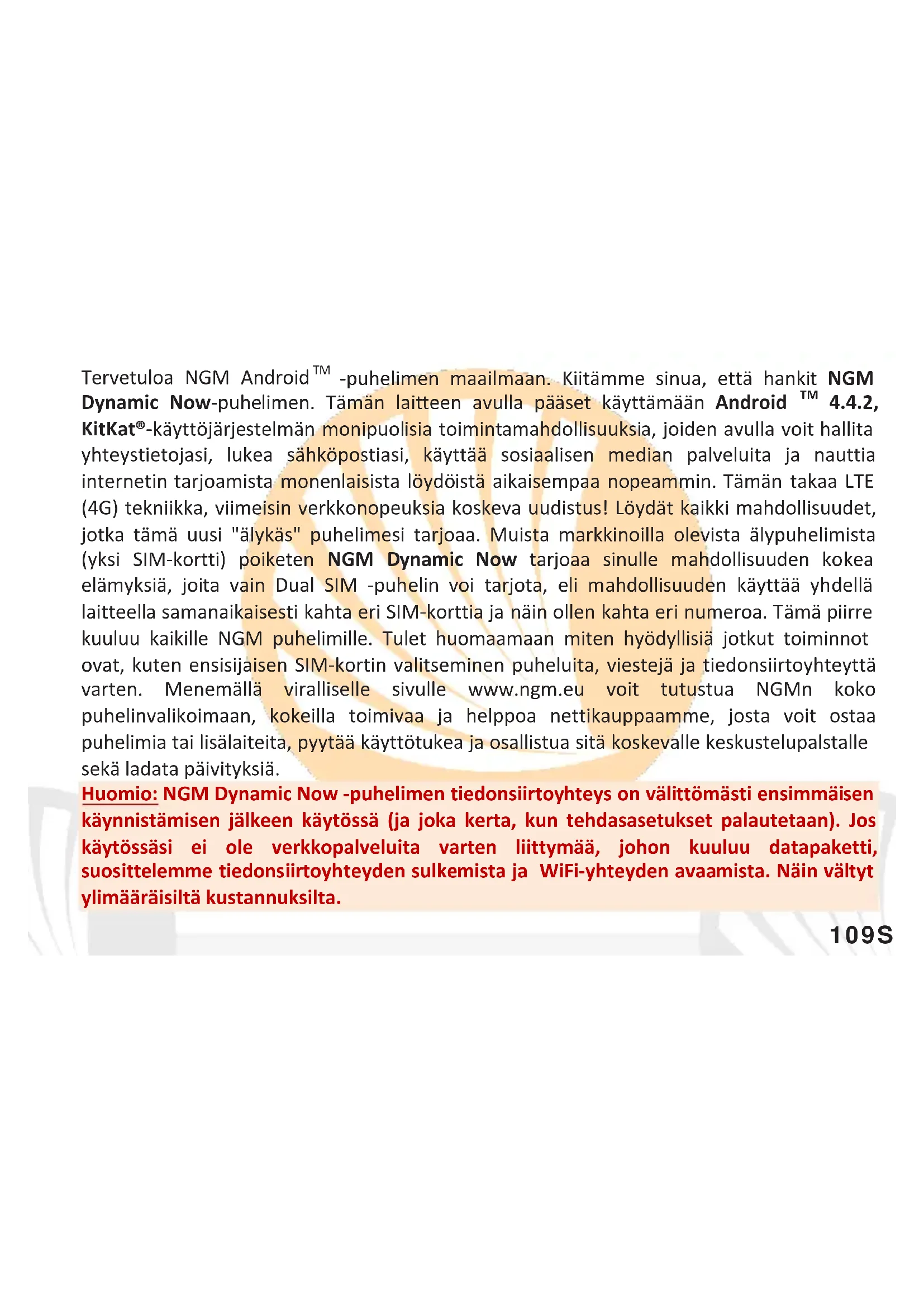 KitKat®-käyttöjärjestelmän monipuolisia toimintamahdollisuuksia, joiden avulla voit hallita yhteystietojasi, lukea sähköpostiasi, käyttää sosiaalisen median palveluita ja nauttia internetin tarjoamista monenlaisista löydöistä aikaisempaa nopeammin. Tämän takaa LTE (4G) tekniikka, viimeisin verkkonopeuksia koskeva uudistus! Löydät kaikki mahdollisuudet, jotka tämä uusi "älykäs" puhelimesi tarjoaa. Muista markkinoilla olevista älypuhelimista (yksi SIM-kortti) poiketen NGM Dynamic Now tarjoaa sinulle mahdollisuuden kokea elämyksiä, joita vain Dual SIM -puhelin voi tarjota, eli mahdollisuuden käyttää yhdellä laitteella samanaikaisesti kahta eri SIM-korttia ja näin ollen kahta eri numeroa. Tämä piirre kuuluu kaikille NGM puhelimille. Tulet huomaamaan miten hyödyllisiä jotkut toiminnot ovat, kuten ensisijaisen SIM-kortin valitseminen puheluita, viestejä ja tiedonsiirtoyhteyttä varten. Menemällä viralliselle sivulle www.ngm.eu voit tutustua NGMn koko puhelinvalikoimaan, kokeilla toimivaa ja helppoa nettikauppaamme, josta voit ostaa puhelimia tai lisälaiteita, pyytää käyttötukea ja osallistua sitä koskevalle keskustelupalstalle sekä ladata päivityksiä. Huomio: NGM Dynamic Now -puhelimen tiedonsiirtoyhteys on välittömästi ensimmäisen käynnistämisen jälkeen käytössä (ja joka kerta, kun tehdasasetukset palautetaan). Jos käytössäsi ei ole verkkopalveluita varten liittymää, johon kuuluu datapaketti, suosittelemme tiedonsiirtoyhteyden sulkemista ja WiFi-yhteyden avaamista. Näin vältyt ylimääräisiltä kustannuksilta.110 SUOMI Käytön aloitus