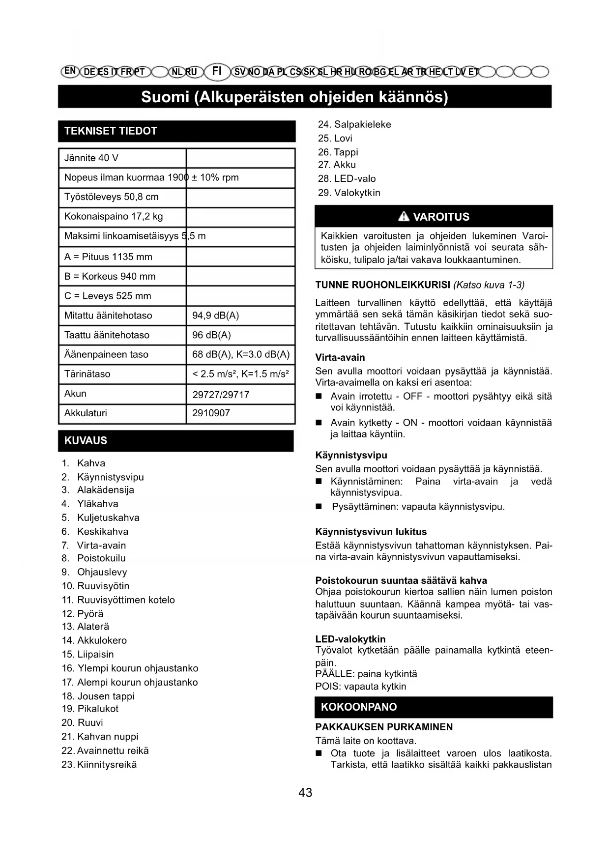 SV NO DA PL CS SK SL HR HU RO BG EL AR TR HE LT LV ET TEKNISET TIEDOT Jännite 40 VNopeus ilman kuormaa 1900 ± 10% rpmTyöstöleveys 50,8 cmKokonaispaino 17,2 kgMaksimi linkoamisetäisyys 5,5 mA = Pituus 1135 mmB = Korkeus 940 mmC = Leveys 525 mmMitattu äänitehotaso 94,9 dB(A)Taattu äänitehotaso 96 dB(A)Äänenpaineen taso 68 dB(A), K=3.0 dB(A)Tärinätaso ﹤ 2.5 m/s², K=1.5 m/s² Akun 29727/29717Akkulaturi 2910907 KUVAUS