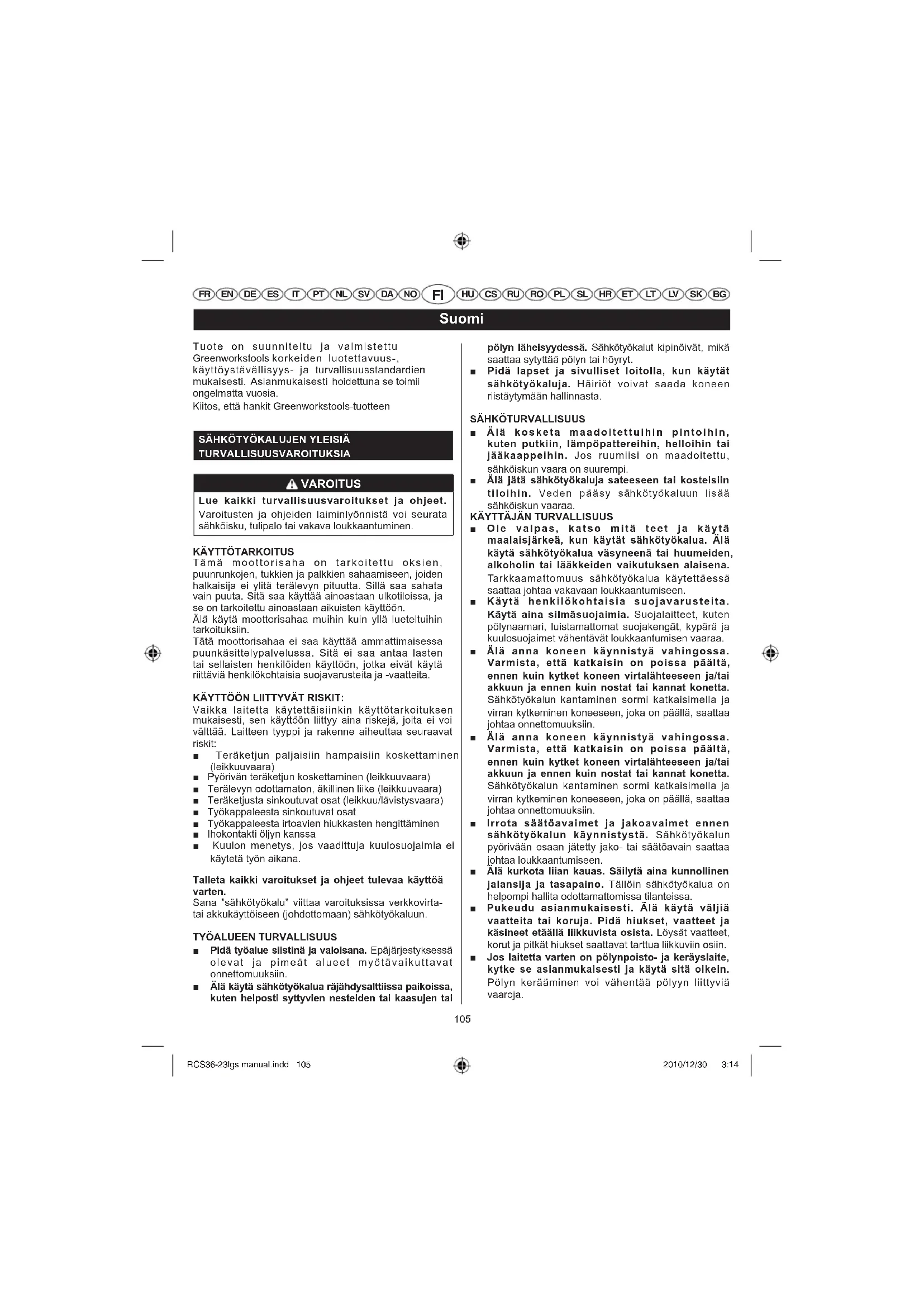 FR EN DE ES IT PT NL SV DA NO HU CS RU RO PL SL HR ET LT LV SK BG SÄHKÖTYÖKALUN KÄYTTÖ JA HUOLTO Käytä työhön sopivaa sähkötyökalua. Asianmukainen sähkötyökalu hoitaa työt paremmin ja turvallisemmin sillä nopeudella/teholla, jota varten se on suunniteltu. Älä käytä sähkötyökalua, jos se ei käynnisty ja sammu katkaisimesta. Jos sähkötyökalua ei voida hallita katkaisimella, se on vaarallinen ja vaatii korjaamista. Irrota pistoke virranlähteestä, ennen kuin teet säätöjä, vaihdat varusteita tai varastoit sähkötyökalun. Tällaiset varotoimet pienentävät sitä vaaraa, että sähkötyökalu käynnistyisi vahingossa. Varastoi sähkötyökalu pois lasten ulottuvilta äläkä anna kenenkään, joka ei tunne konetta tai näitä ohjeita, käyttää sitä. Sähkötyökalut ovat vaarallisia kouluttamattomien käyttäjien käsissä. Huolla sähkötyökalut. Tarkista, että liikkuvat osat on kohdistettu oikein ja että ne liikkuvat kunnolla, että osia ei ole rikkoutunut ja että mikään muu seikka ei haittaa sähkötyökalun toimintaa. Jos sähkötyökalu vioittuu, korjaa se ennen käyttöä. Onnettomuudet johtuvat usein sähkötyökalujen huonosta huollosta. Pidä leikkuutyökalut terävinä ja puhtaina. Asianmukaisesti huolletut leikkuutyökalut, joiden leikkuupinnat ovat teräviä, eivät jumiudu helposti ja niitä on helppo hallita. Käytä sähkötyökalua, lisävarusteita, teriä jne. näiden ohjeiden mukaisesti ja sähkötyökalulle tarkoitetulla tavalla. Huomioi työolosuhteet ja tehtävän työn laatu. Sähkötyökalun käyttö muuhun kuin sille tarkoitettuun työhön voi aiheuttaa vaarallisia tilanteita. AKKUKÄYTTÖISEN TYÖKALUN KÄYTTÖ JA HOITO Varmista, että käynnistyskytkin on ”seis” asennossa ja lukittuna ennen, kuin asetat akun sisään. Akun asentaminen käyntiasennossa olevaan työkaluun voi aiheuttaa onnettomuuksia. Älä lataa työkalun akkua muulla, kuin valmistajan suosittelemalla laturilla. Latauslaite on tarkoitettu ennalta määrätyille akkutyypeille ja se voi aiheuttaa tulipalon, jos sitä käytetään muuntyyppisen akun lataukseen. Johdottoman työkalun kanssa tulee käyttää vain yhtä erityistä akkutyyppiä. Muunlaisten akkujen käyttö voi aiheuttaa tulipalon. Kun akku ei ole käytössä, pidä se kaukana metalliesineistä kuten liittimistä, kolikoista, avaimista, nauloista, ruuveista ja muista esineistä, jotka saattavat aiheuttaa napojen keskinäisen kytkeytymisen, jonka seurauksena voi olla palovammoja tai tulipalo. Akun napojen oikosulkuun saattaminen voi aiheuttaa palovammoja tai tulipalon. Vältä koskemasta akkunesteeseen liian raskaan käytön aiheuttaman vuodon yhteydessä. Mikäli näin tapahtuu, huuhtele välittömästi saastunut alue runsaalla puhtaalla vedellä. Jos nestettä on joutunut silmiin, ota yhteys lääkäriin. Akkuneste voi aiheuttaa ärsytysherkkyyttä tai palovammoja. HUOLTO Huollata sähkötyökalu pätevällä huoltomiehellä, joka käyttää ainoastaan asianmukaisia varaosia. Tämä varmistaa, että sähkötyökalu on turvallinen. Huolto kaipaa suurta huolellisuutta ja hyvää työkalun tuntemusta: se on annettava pätevän teknikon tehtäväksi. Suosittelemme, että viet työkalun korjattavaksi lähimpään valtuutettuun huoltoliikkeeseen. Käytä vaihdossa yksinomaan alkuperäisiä varaosia. MOOTTORISAHAN TURVALLISUUSVAROITUKSIA Pitele sähkötyökalua vain eristetyistä tartuntapinnoista, sillä moottorisahan ketju saattaa koskettaa sen johtoja. Jos sahan ketju koskettaa sähköistettyä johtoa, sen paljaisiin metalliosiin voi johtua sähköä, mikä voi aiheuttaa käyttäjälle sähköiskun. Älä kosketa teräketjua, kun se on toiminnassa. Tarkista ennen moottorisahan käynnistystä, että teräketju ei ole kosketuksissa mihinkään. Tarkkaamattomuus moottorisahaa käytettäessä voi saada vaatteet tai ruumiinosan tarttumaan teräketjuun. Pidä aina oikealla kädellä kiinni takakädensijasta ja vasemmalla kädellä etukädensijasta. Jos sahaa pidetään vastakkaisesti, loukkaantumisriski kasvaa. Käytä suojalaseja ja kuulosuojaimia. Pään, käsien ja jalkojen suojaimia suositellaan. Riittävät suojavaatteet vähentävät loukkaantumisia, jotka aiheutuvat lentävistä kappaleista tai kontaktista teräketjuun. Älä käytä moottorisahaa puusta käsin. Moottorisahan käyttö puussa saattaa johtaa loukkaantumiseen. Ota aina hyvä jalansija ja käytä moottorisahaa vain, kun seisot kiinteällä, turvallisella tasapinnalla. Liukkaat tai epävakaat pinnat, kuten tikkaat, voivat saada käyttäjän menettämään tasapainon tai sahan hallinnan. Muista sahatessasi jännitettyä oksaa, että se potkaisee katketessaan takaisin. Kun puun säikeiden jännitys vapautuu, taipuisa oksa voi iskeä käyttäjää ja/tai saada hänet menettämään moottorisahan hallinnan. Ole erittäin varovainen sahatessasi pensaita ja taimia. Ohut puu voi tarttua teräketjuun ja iskeytyä sinua kohti tai vetää sinut pois tasapainosta. RCS36-23lgs manual.indd 106 RCS36-23lgs manual.indd 106 2010/12/30 3:14 2010/12/30 3:14107 Suomi