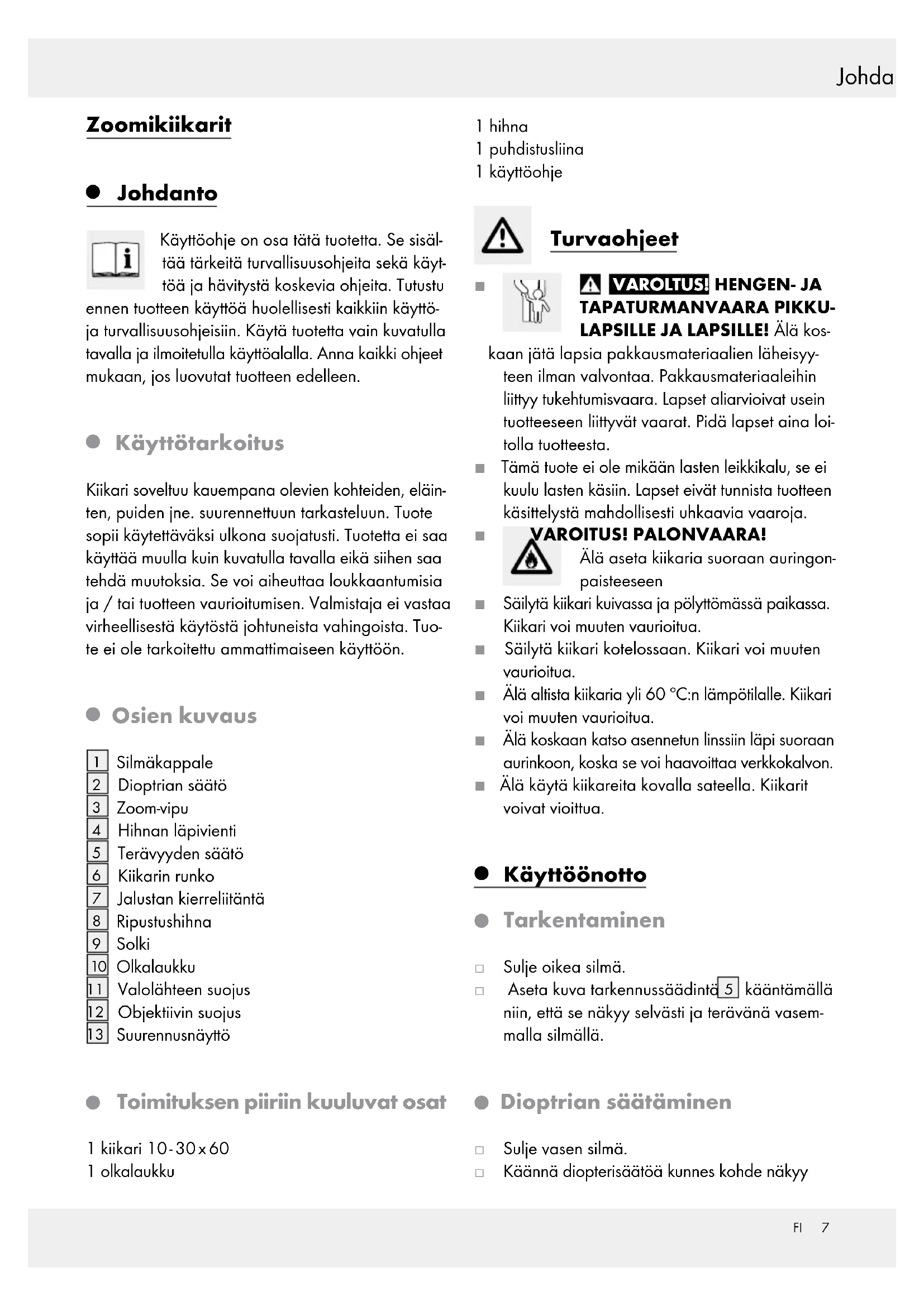 VAROLTUS! HENGEN- JA TAPATURMANVAARA PIKKU- LAPSILLE JA LAPSILLE! Älä kos- kaan jätä lapsia pakkausmateriaalien läheisyy- teen ilman valvontaa. Pakkausmateriaaleihin liittyy tukehtumisvaara. Lapset aliarvioivat usein tuotteeseen liittyvät vaarat. Pidä lapset aina loi- tolla tuotteesta. J Tämä tuote ei ole mikään lasten leikkikalu, se ei kuulu lasten käsiin. Lapset eivät tunnista tuotteen käsittelystä mahdollisesti uhkaavia vaaroja. J VAROITUS! PALONVAARA! Älä aseta kiikaria suoraan auringon- paisteeseen J Säilytä kiikari kuivassa ja pölyttömässä paikassa. Kiikari voi muuten vaurioitua. J Säilytä kiikari kotelossaan. Kiikari voi muuten vaurioitua. J Älä altista kiikaria yli 60 ºC:n lämpötilalle. Kiikari voi muuten vaurioitua. J Älä koskaan katso asennetun linssiin läpi suoraan aurinkoon, koska se voi haavoittaa verkkokalvon. J Älä käytä kiikareita kovalla sateella. Kiikarit voivat vioittua.
