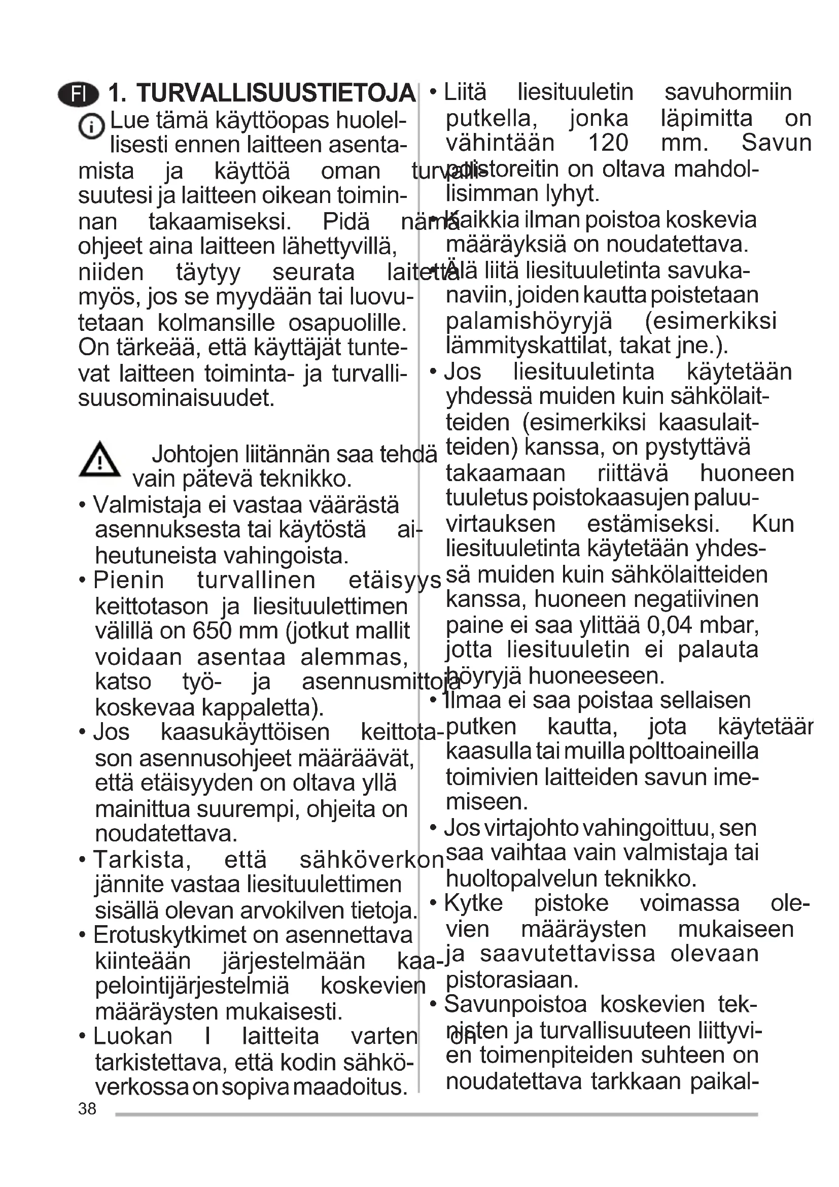 - Tilassatäytyyollaasianmukai- nen tuuletus kun liesituuletinta käytetään samanaikaisesti kaasulla tai muilla polttoaineilla toimivien laitteiden kanssa (ei koske laitteita, jotka poistavat tilaan vain ilmaa).