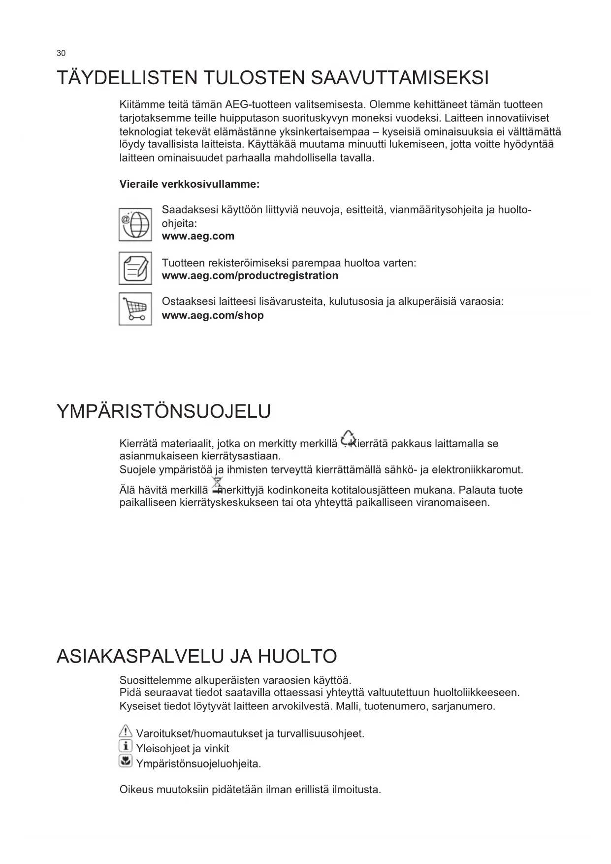 Kiitämme teitä tämän AEG-tuotteen valitsemisesta. Olemme kehittäneet tämän tuotteen tarjotaksemme teille huipputason suorituskyvyn moneksi vuodeksi. Laitteen innovatiiviset teknologiat tekevät elämästänne yksinkertaisempaa – kyseisiä ominaisuuksia ei välttämättä löydy tavallisista laitteista. Käyttäkää muutama minuutti lukemiseen, jotta voitte hyödyntää laitteen ominaisuudet parhaalla mahdollisella tavalla. Vieraile verkkosivullamme: Saadaksesi käyttöön liittyviä neuvoja, esitteitä, vianmääritysohjeita ja huolto- ohjeita: www.aeg.com Tuotteen rekisteröimiseksi parempaa huoltoa varten: www.aeg.com/productregistration Ostaaksesi laitteesi lisävarusteita, kulutusosia ja alkuperäisiä varaosia: www.aeg.com/shop
