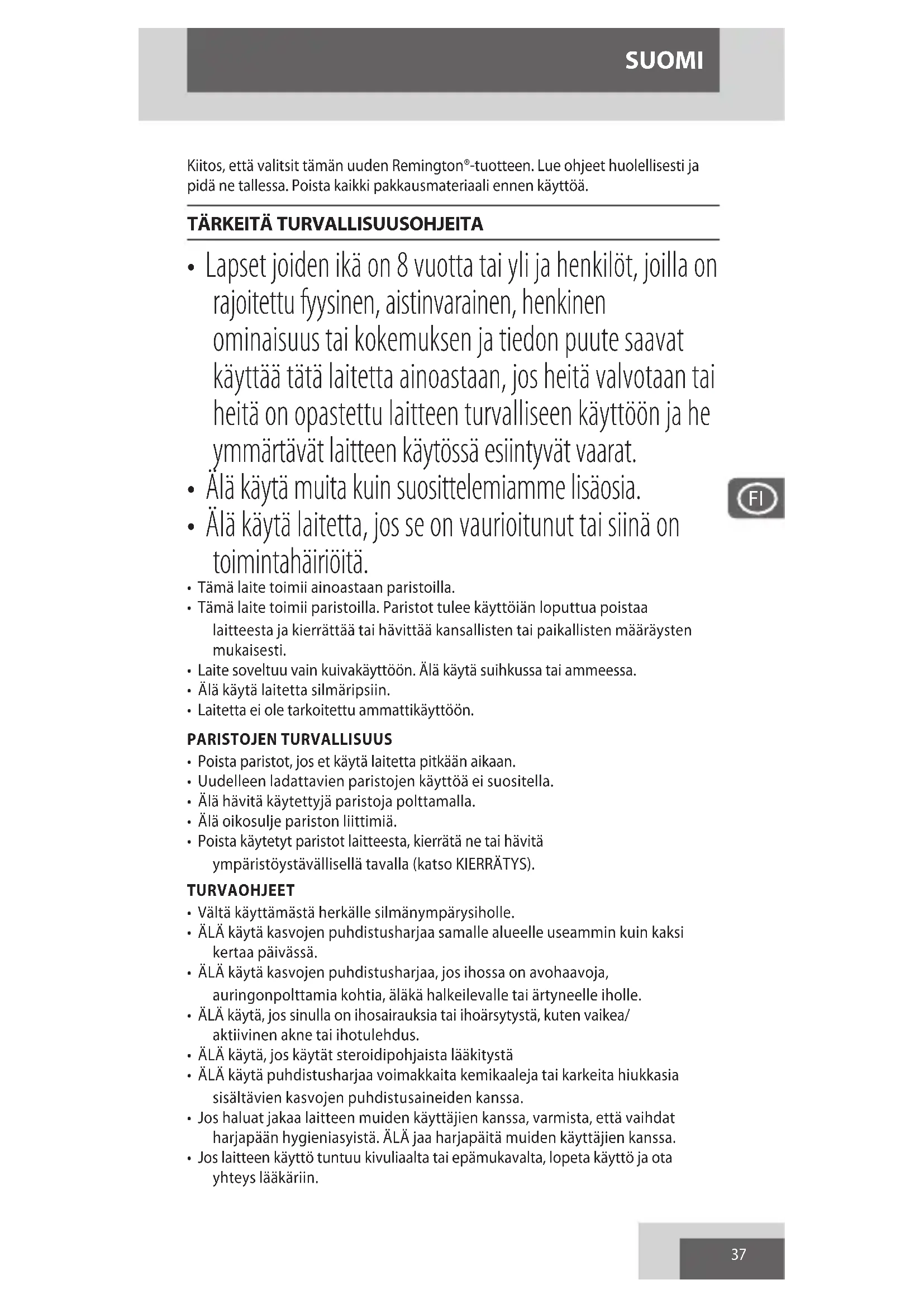 - Laitetta ei ole tarkoitettu ammattikäyttöön. PARISTOJEN TURVALLISUUS