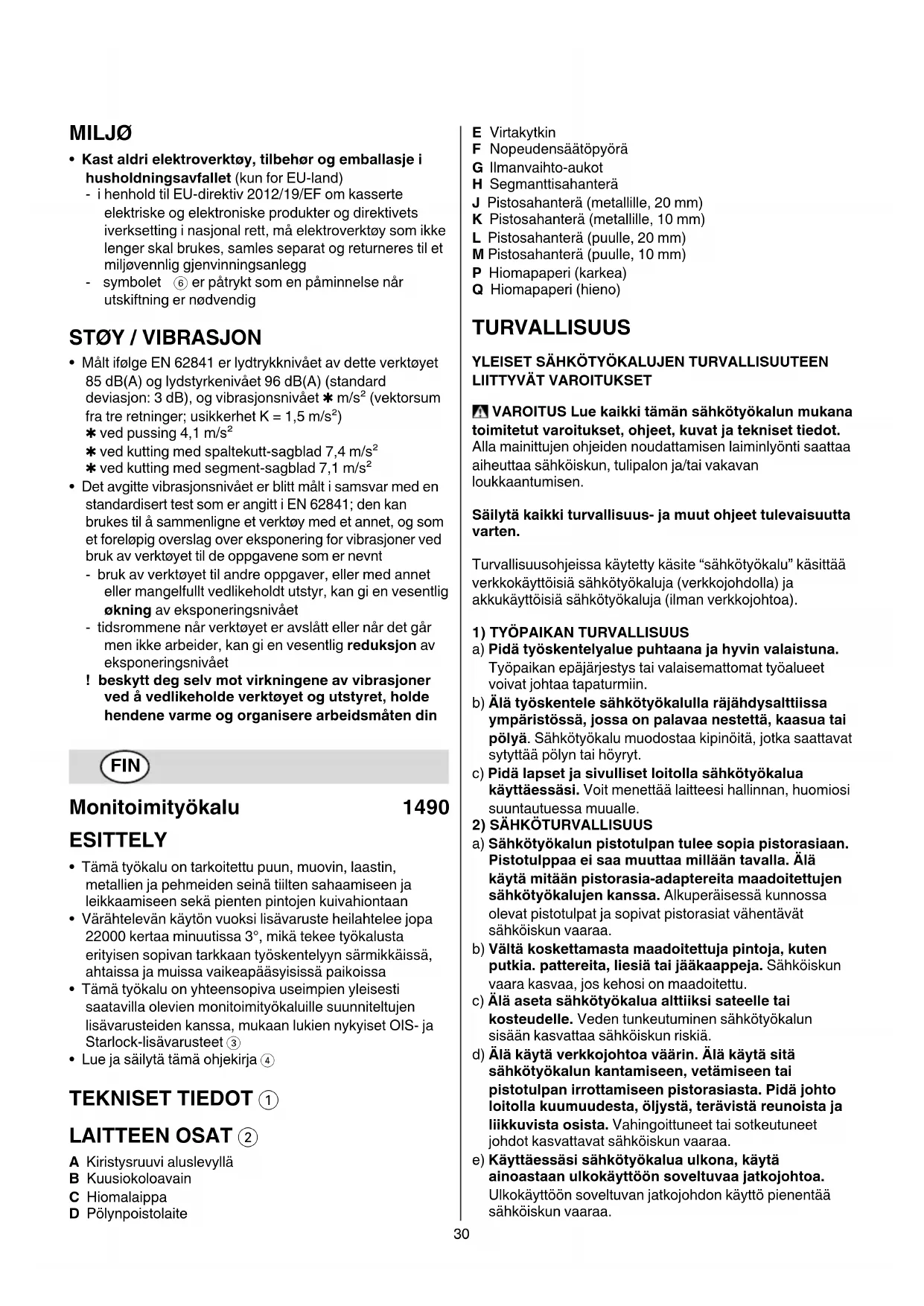 - Lue ja säilytä tämä ohjekirja 4 TEKNISET TIEDOT 1 LAITTEEN OSAT 2 A Kiristysruuvi aluslevyllä B Kuusiokoloavain C Hiomalaippa D Pölynpoistolaite E Virtakytkin F Nopeudensäätöpyörä G Ilmanvaihto-aukot H Segmanttisahanterä J Pistosahanterä (metallille, 20 mm) K Pistosahanterä (metallille, 10 mm) L Pistosahanterä (puulle, 20 mm) M Pistosahanterä (puulle, 10 mm) P Hiomapaperi (karkea) Q Hiomapaperi (hieno) TURVALLISUUS