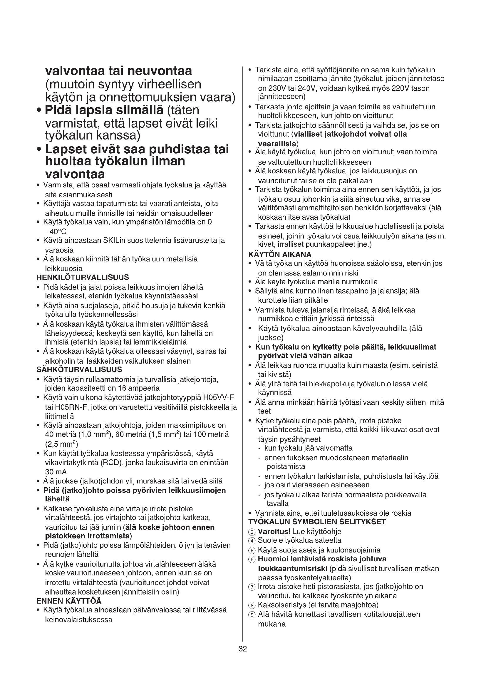- Lapset 8-vuotiaat ja sitä vanhemmat ja henkilöt, jotka rajoitteisten fyysisten, aistillisten tai henkisten kykyjensä, kokemattomuutensa tai tietämättömyytensä takia eivät turvallisesti voi käyttää työkalun, eivät saa käyttää sitä ilman vastuullisen henkilön32 valvontaa tai neuvontaa (muutoin syntyy virheellisen käytön ja onnettomuuksien vaara)