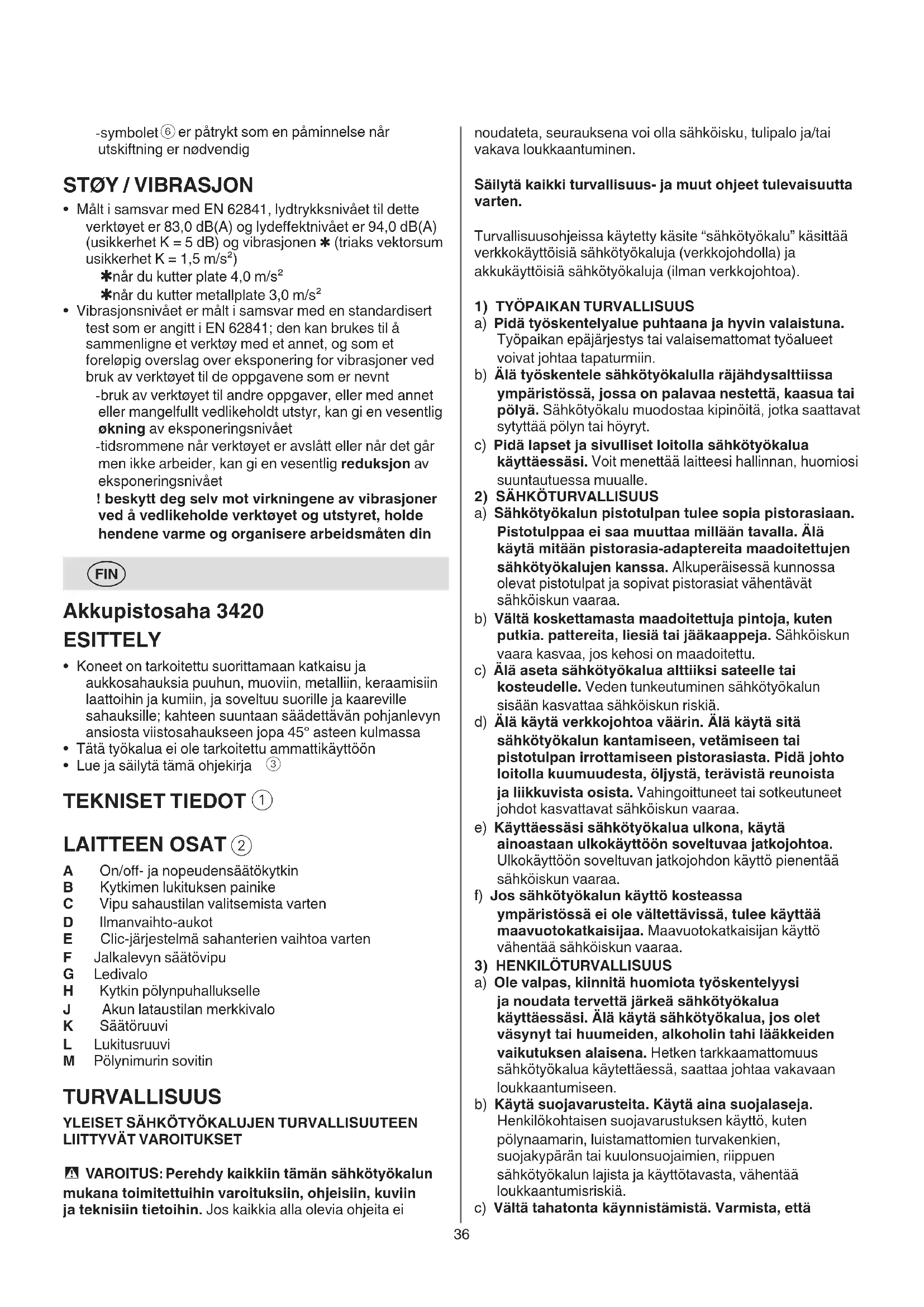 A On/o- ja nopeudensäätökytkin B Kytkimen lukituksen painike C Vipu sahaustilan valitsemista varten D Ilmanvaihto-aukot E Clic-järjestelmä sahanterien vaihtoa varten F Jalkalevyn säätövipu G Ledivalo H Kytkin pölynpuhallukselle J Akun lataustilan merkkivalo K Säätöruuvi L Lukitusruuvi M Pölynimurin sovitin TURVALLISUUS