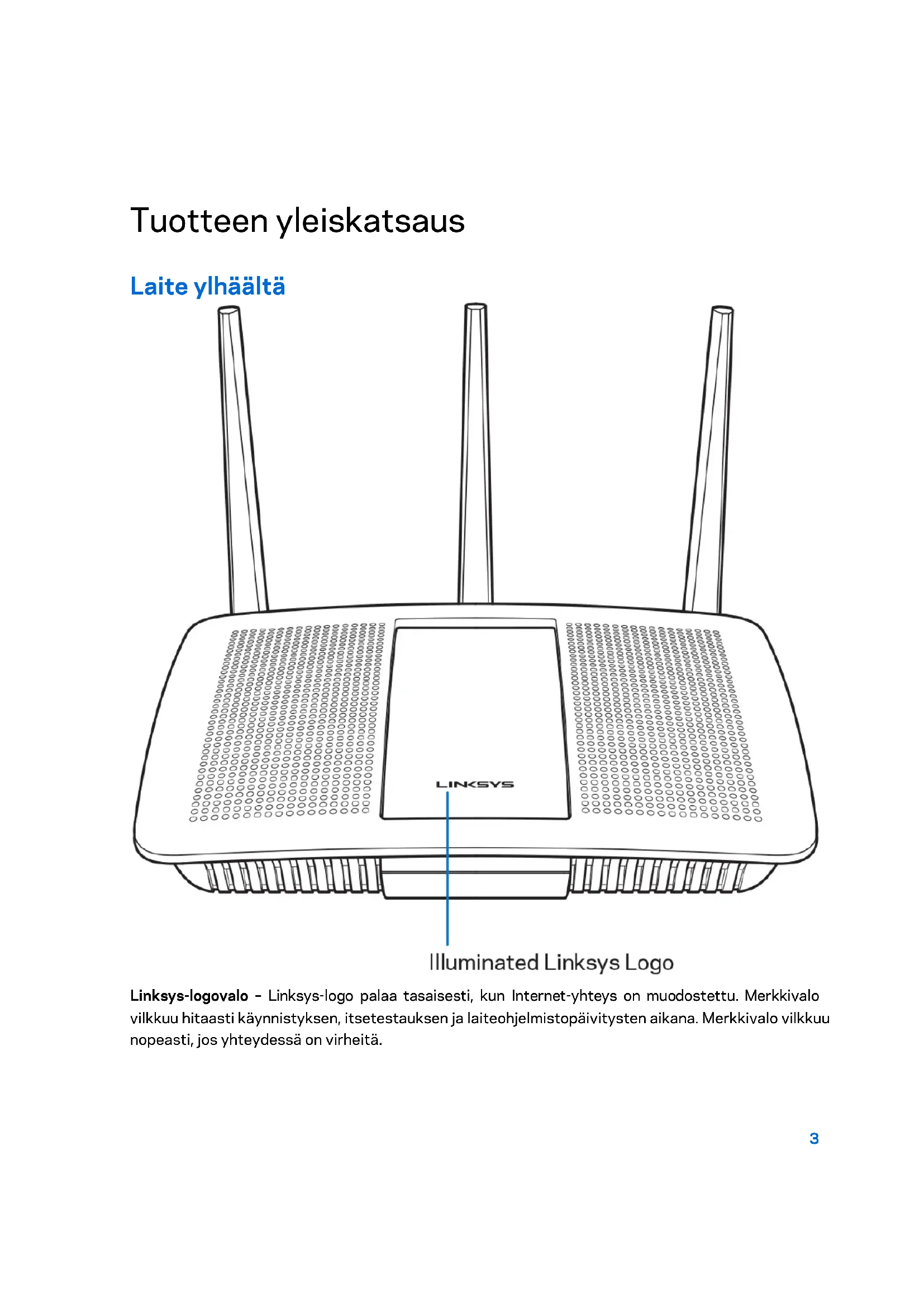 Linksys.com/support/EA7300 (käyttöoppaat, lataukset, usein kysytyt kysymykset, tekninen tuki, tukipalvelun keskustelutoiminto, keskustelupalstat) Huomautus: Tuotteessa käytetyn kolmannen osapuolen ohjelmiston lisenssit ja ilmoitukset ovat saatavilla osoitteessa http://support.linksys.com/en-us/license. Lisätietoja GPL-lisenssistä ja lähdekoodin pyyntölomake on osoitteessa http://support.linksys.com/en-us/gplcodecenter. Reitittimen asentaminen