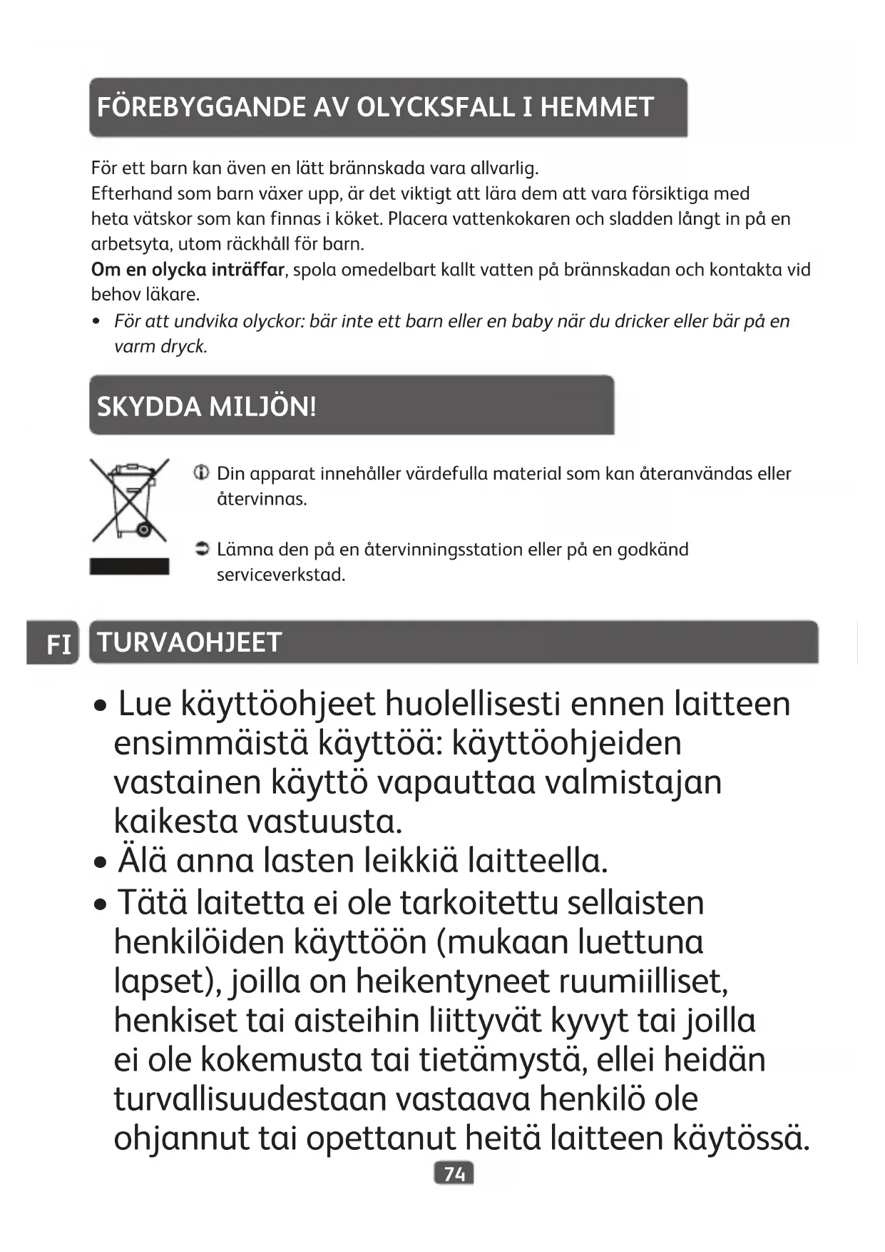 SUOJELE YMPÄRISTÖÄ! Laitteessasionmoniahyödynnettäviäjakierrätettäviämateriaaleja Toimitasekeräyspisteeseentaisellaisenpuuttuessavaltuutettuun huoltokeskukseen,jottasekäsiteltäisiinasianmukaisesti. ONGELMATAPAUKSISSA VEDENKEITTIMESSÄSI EI OLE NÄKYVIÄ VAURIOITA