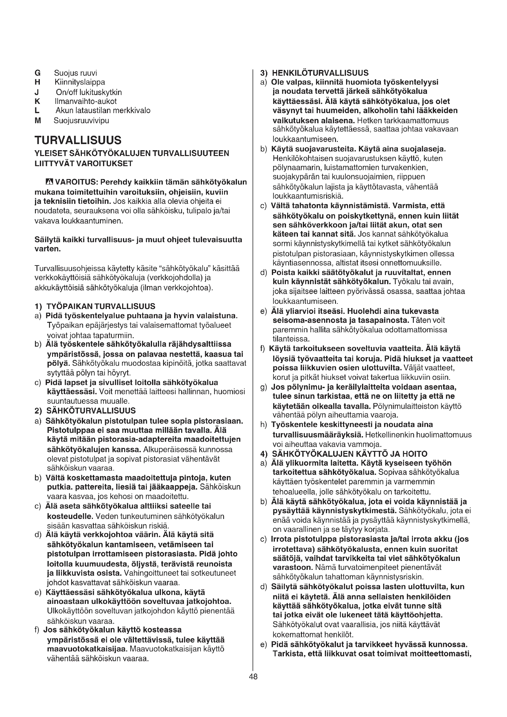 a) Älä ylikuormita laitetta. Käytä kyseiseen työhön tarkoitettua sähkötyökalua. Sopivaa sähkötyökalua käyttäen työskentelet paremmin ja varmemmin tehoalueella, jolle sähkötyökalu on tarkoitettu. b) Älä käytä sähkötyökalua, jota ei voida käynnistää ja pysäyttää käynnistyskytkimestä. Sähkötyökalu, jota ei enää voida käynnistää ja pysäyttää käynnistyskytkimellä, on vaarallinen ja se täytyy korjata. c) Irrota pistotulppa pistorasiasta ja/tai irrota akku (jos irrotettava) sähkötyökalusta, ennen kuin suoritat säätöjä, vaihdat tarvikkeita tai viet sähkötyökalun varastoon. Nämä turvatoimenpiteet pienentävät sähkötyökalun tahattoman käynnistysriskin. d) Säilytä sähkötyökalut poissa lasten ulottuvilta, kun niitä ei käytetä. Älä anna sellaisten henkilöiden käyttää sähkötyökalua, jotka eivät tunne sitä tai jotka eivät ole lukeneet tätä käyttöohjetta. Sähkötyökalut ovat vaarallisia, jos niitä käyttävät kokemattomat henkilöt. e) Pidä sähkötyökalut ja tarvikkeet hyvässä kunnossa. Tarkista, että liikkuvat osat toimivat moitteettomasti, G Suojus ruuvi H Kiinnityslaippa J On/o lukituskytkin K Ilmanvaihto-aukot L Akun lataustilan merkkivalo M Suojusruuvivipu TURVALLISUUS