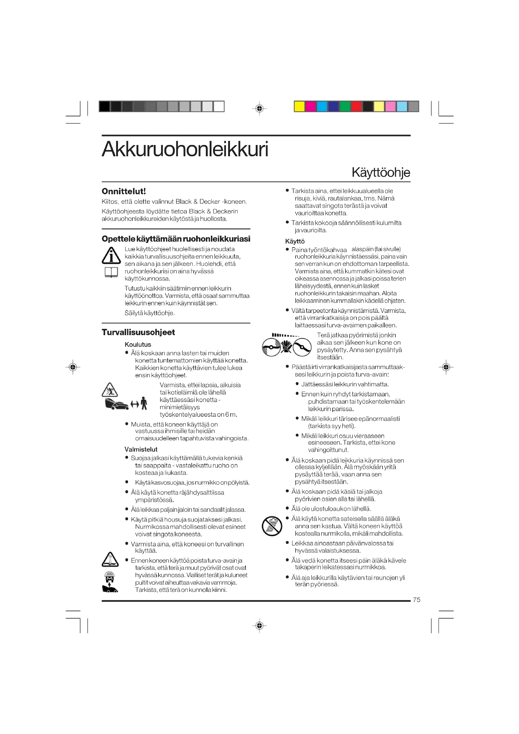 (garanteret) dB(A) 96 Den vægtede geometriske middelværdi af accelerationsfrekvensen i henhold til EN 50144: Brian Cooke Director of Engineering Spennymoor, County Durham DL16 6JG, United Kingdom 1-12-200175 Akkuruohonleikkuri Käyttöohje Onnittelut! Kiitos, että olette valinnut Black & Decker -koneen. Käyttöohjeesta löydätte tietoa Black & Deckerin akkuruohonleikkureiden käytöstä ja huollosta. Opettele käyttämään ruohonleikkuriasi Lue käyttöohjeet huolellisesti ja noudata kaikkia turvallisuusohjeita ennen leikkuuta, sen aikana ja sen jälkeen. Huolehdi, että ruohonleikkurisi on aina hyvässä käyttökunnossa. Tutustu kaikkiin säätimiin ennen leikkurin käyttöönottoa. Varmista, että osaat sammuttaa leikkurin ennen kuin käynnistät sen. Säilytä käyttöohje. Turvallisuusohjeet Koulutus
