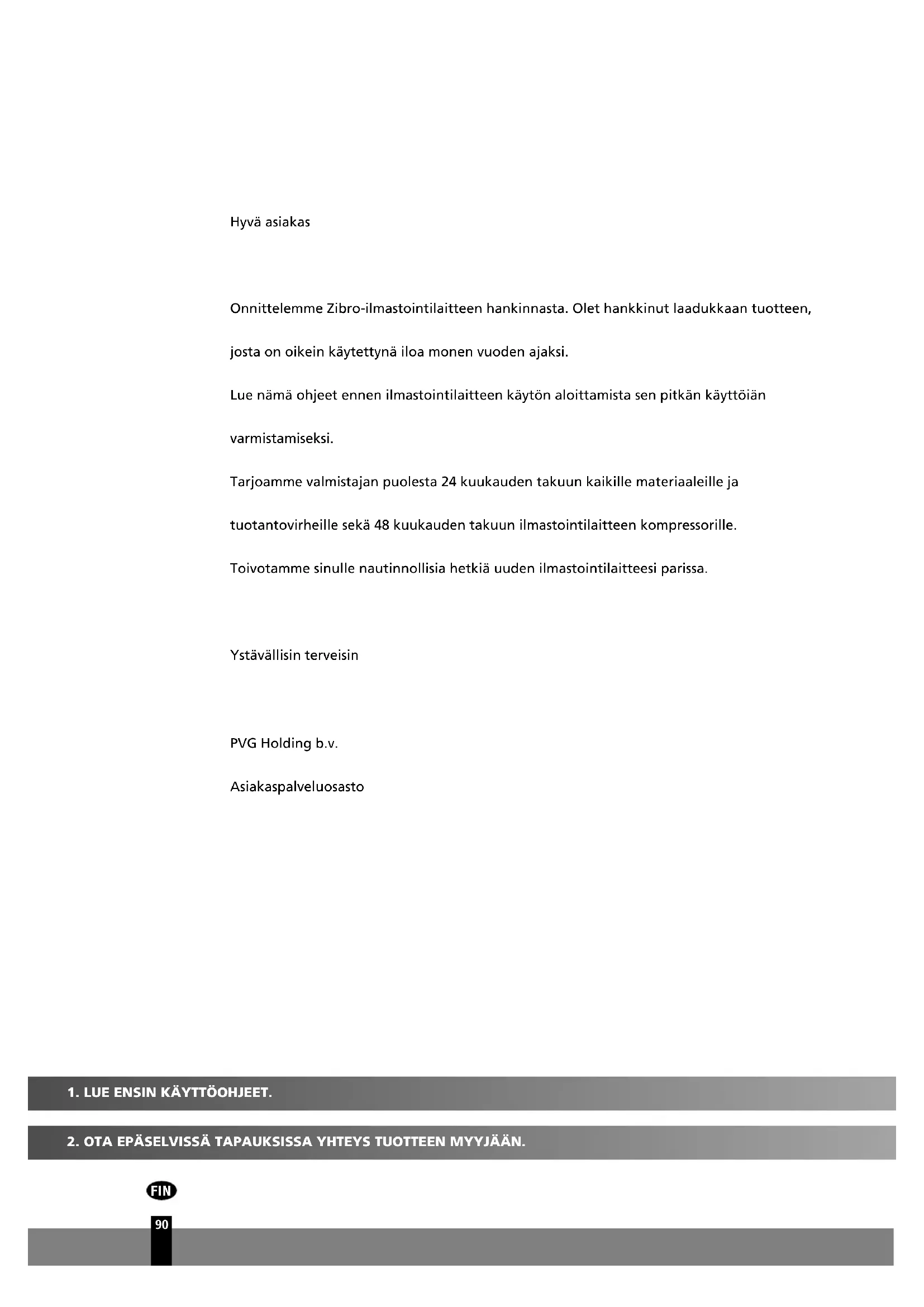Hyvä asiakas Onnittelemme Zibro-ilmastointilaitteen hankinnasta. Olet hankkinut laadukkaan tuotteen, josta on oikein käytettynä iloa monen vuoden ajaksi. Lue nämä ohjeet ennen ilmastointilaitteen käytön aloittamista sen pitkän käyttöiän varmistamiseksi. Tarjoamme valmistajan puolesta 24 kuukauden takuun kaikille materiaaleille ja tuotantovirheille sekä 48 kuukauden takuun ilmastointilaitteen kompressorille. Toivotamme sinulle nautinnollisia hetkiä uuden ilmastointilaitteesi parissa. Ystävällisin terveisin PVG Holding b.v. Asiakaspalveluosasto man_S(C)36xx.qxd:man_S18xx 15-03-13 13:45 Page 90FIN
