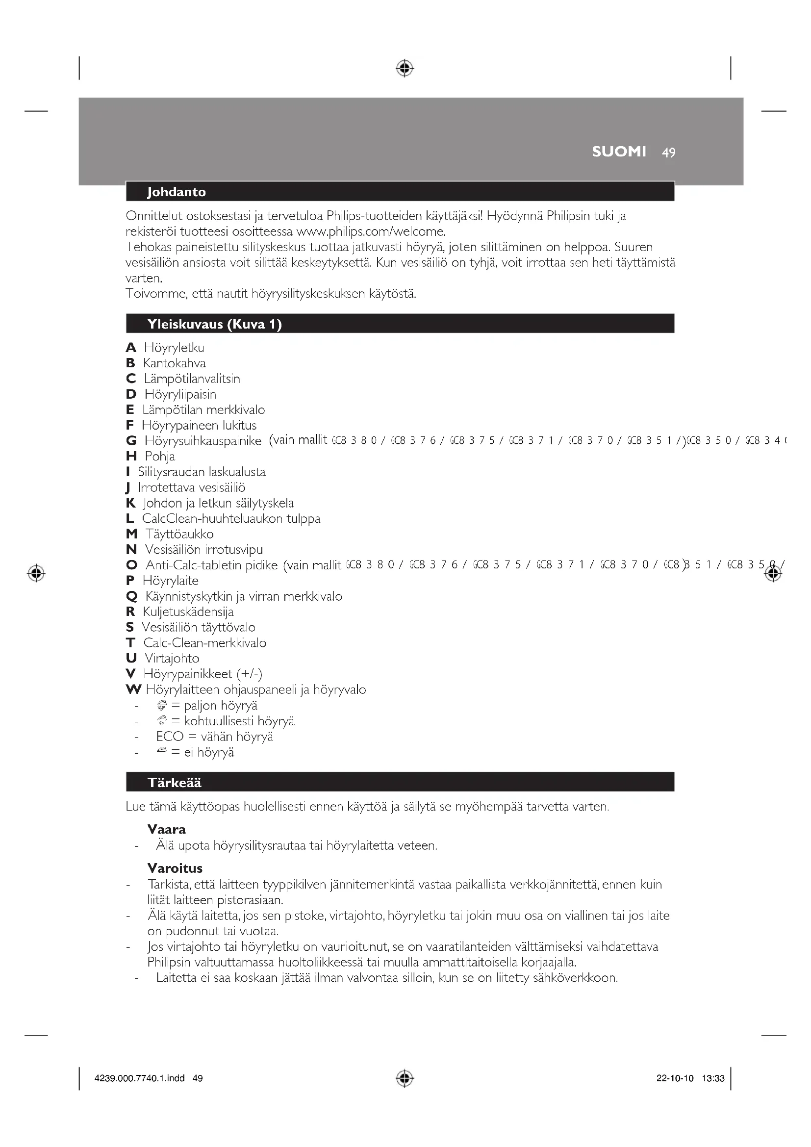 GC8380/GC8376/GC8375/GC8371/GC8370/GC8351/GC8350/GC8340/GC8330 GC8380/GC8376/GC8375/GC8371/GC8370/GC8351/GC8350/GC8340- Laitetta ei ole tarkoitettu lasten tai sellaisten henkilöiden käyttöön, joiden fyysinen tai henkinen toimintakyky on rajoittunut tai joilla ei ole kokemusta tai tietoa laitteen käytöstä, muuten kuin heidän turvallisuudestaan vastaavan henkilön valvonnassa ja ohjauksessa. - Pienten lasten ei saa antaa leikkiä laitteella. - Älä anna virtajohdon tai höyryletkun koskettaa silitysraudan kuumaa pohjaa. - Jos CalcClean-huuhteluaukon tulpan alta purkautuu höyryä laitteen lämmityksen aikana, sammuta laite ja kiristä CalcClean-huuhteluaukon tulppaa. Jos höyryä purkautuu edelleen laitteen lämmityksen aikana, sammuta laite ja ota yhteys Philipsin valtuuttamaan huoltoliikkeeseen. - Älä koskaan irrota CalcClean-huuhteluaukon tulppaa, kun höyrylaite on kuuma. - Älä käytä höyrylaitteessa muuta kuin laitteen mukana toimitettua CalcClean-huuhteluaukon tulppaa, sillä se toimii samalla turvaventtiilinä.