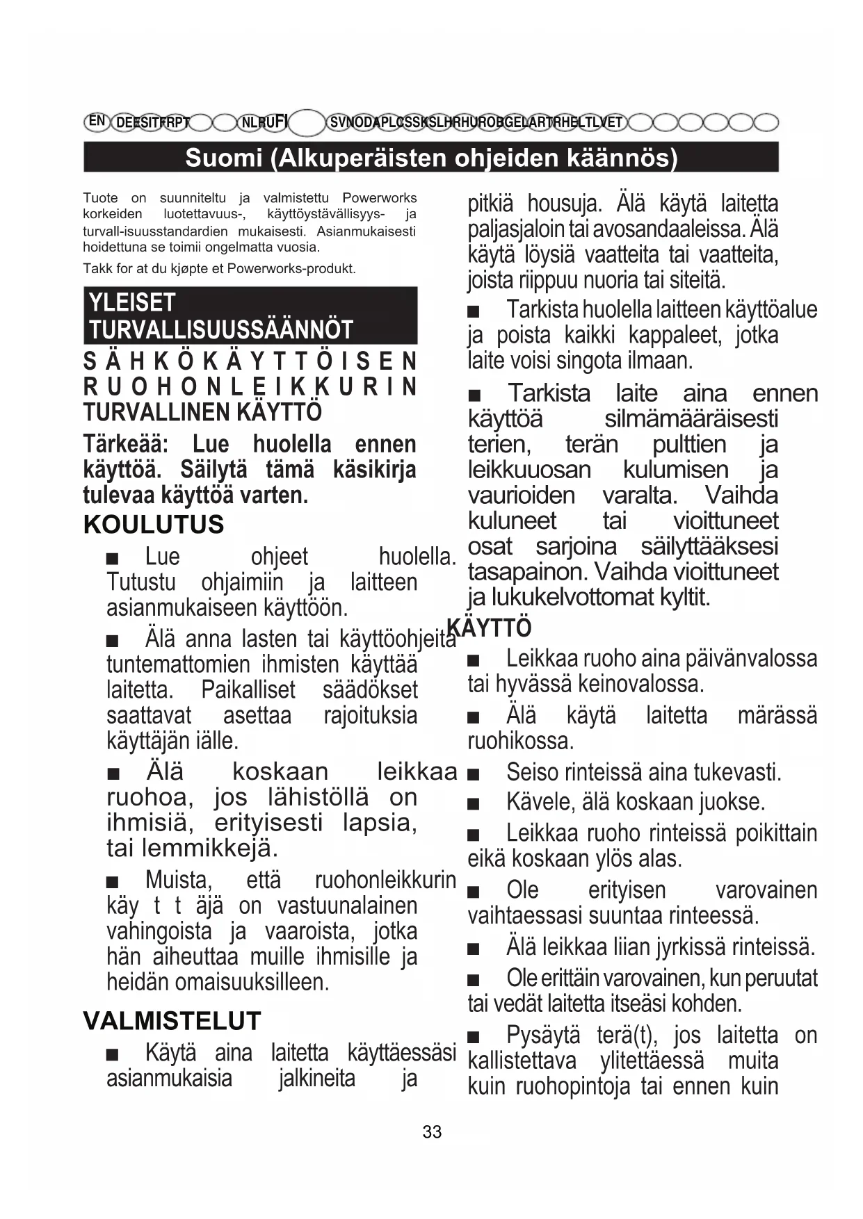DE ES IT FR PT NL RU FI SV NO DA PL CS SK SL HR HU RO BG EL AR TR HE LT LV ET Tuote on suunniteltu ja valmistettu Powerworks korkeiden luotettavuus-, käyttöystävällisyys- ja turvall-isuusstandardien mukaisesti. Asianmukaisesti hoidettuna se toimii ongelmatta vuosia.Takk for at du kjøpte et Powerworks-produkt. YLEISET