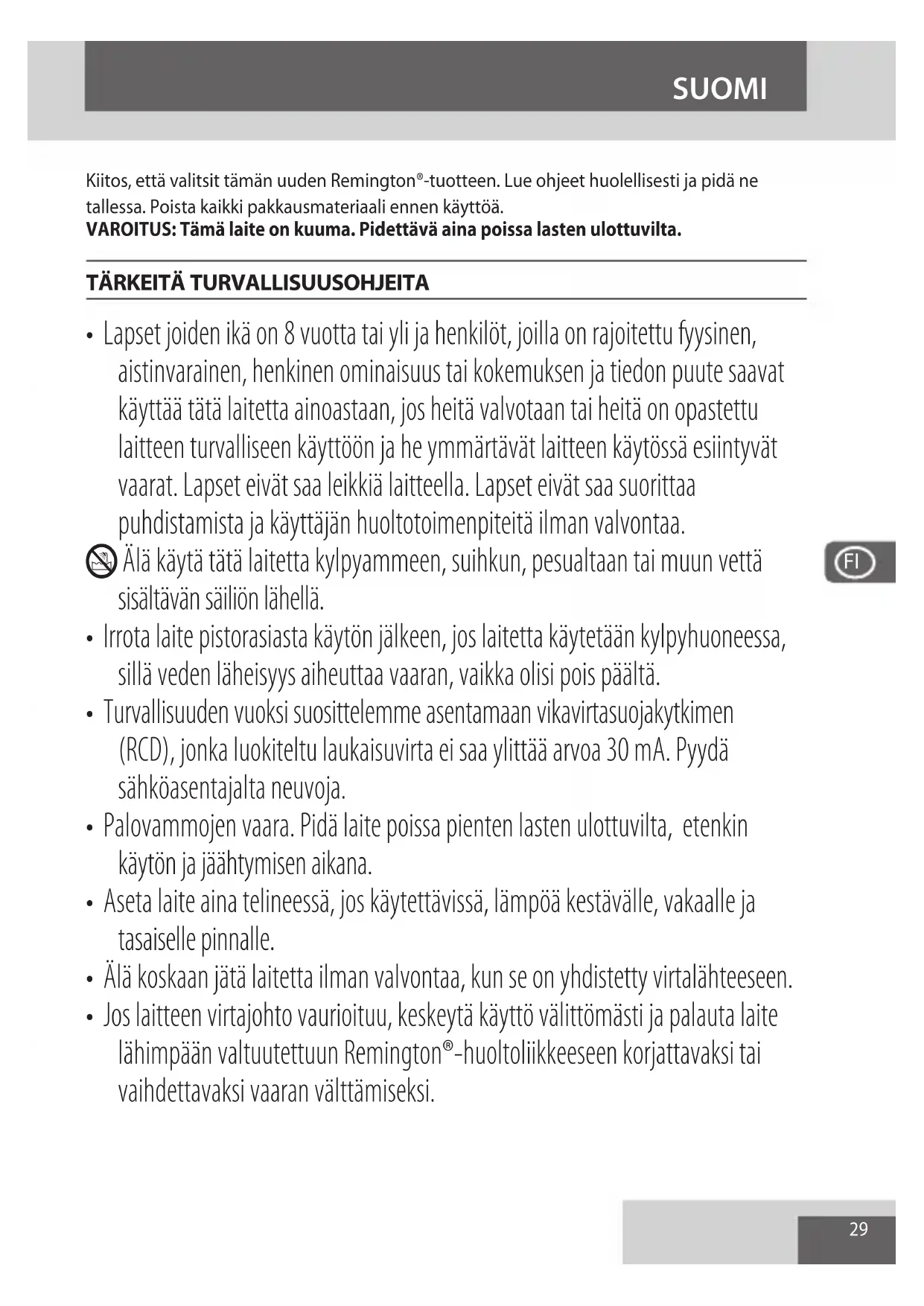 - Jos laitteen virtajohto vaurioituu, keskeytä käyttö välittömästi ja palauta laite lähimpään valtuutettuun Remington®-huoltoliikkeeseen korjattavaksi tai vaihdettavaksi vaaran välttämiseksi. SUOMI