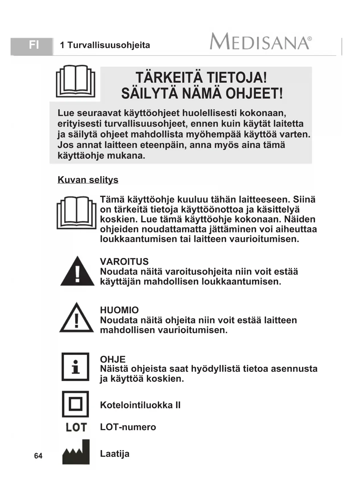 5 Garantie 63TÄRKEITÄ TIETOJA! SÄILYTÄ NÄMÄ OHJEET! Tämä käyttöohje kuuluu tähän laitteeseen. Siinä on tärkeitä tietoja käyttöönottoa ja käsittelyä koskien. Lue tämä käyttöohje kokonaan. Näiden ohjeiden noudattamatta jättäminen voi aiheuttaa loukkaantumisen tai laitteen vaurioitumisen. VAROITUS Noudata näitä varoitusohjeita niin voit estää käyttäjän mahdollisen loukkaantumisen. HUOMIO Noudata näitä ohjeita niin voit estää laitteen mahdollisen vaurioitumisen. OHJE Näistä ohjeista saat hyödyllistä tietoa asennusta ja käyttöä koskien. Kuvan selitys LOT-numero