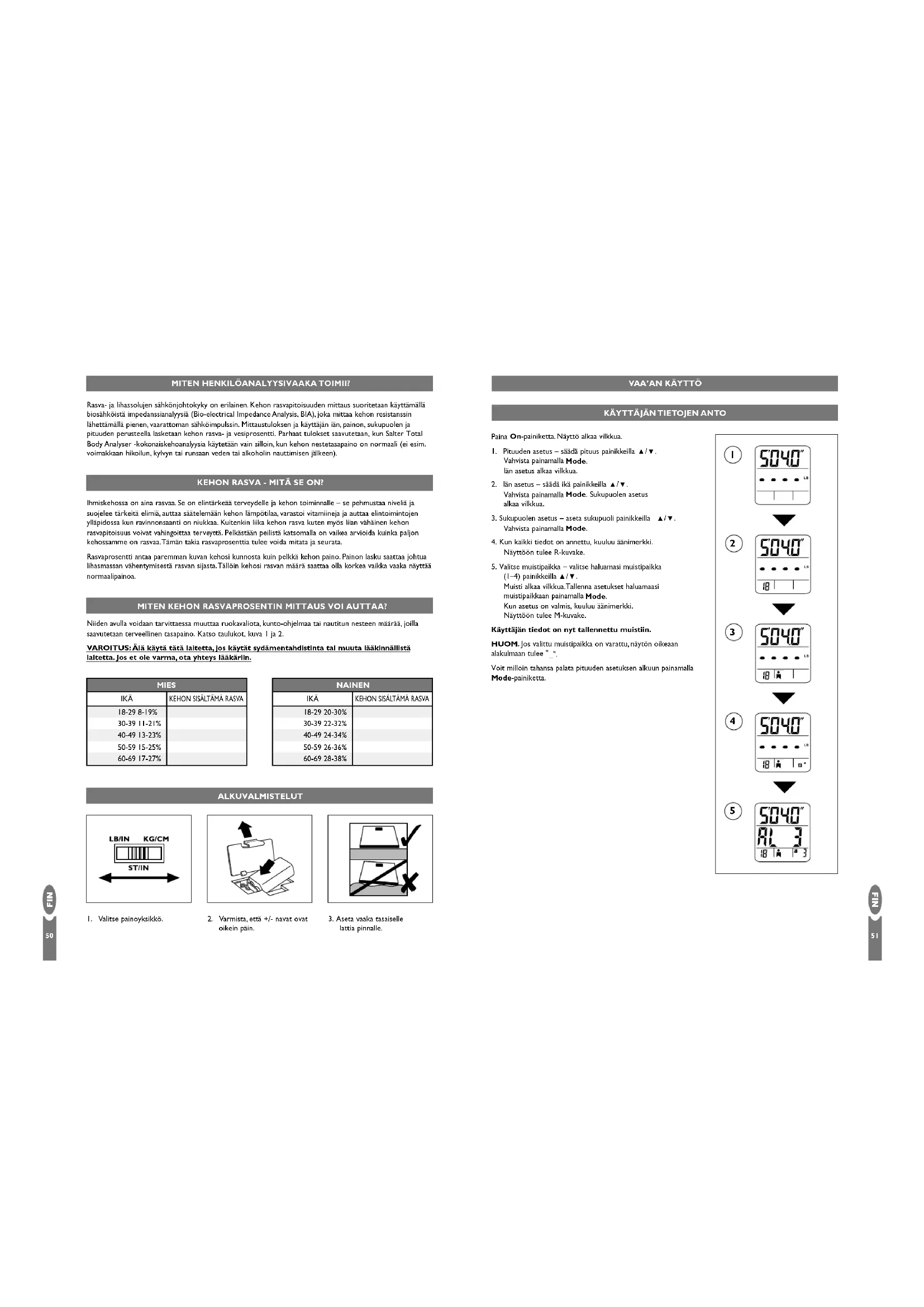 Ihmiskehossa on aina rasvaa. Se on elintärkeää terveydelle ja kehon toiminnalle – se pehmustaa niveliä ja suojelee tärkeitä elimiä, auttaa säätelemään kehon lämpötilaa, varastoi vitamiineja ja auttaa elintoimintojen ylläpidossa kun ravinnonsaanti on niukkaa. Kuitenkin liika kehon rasva kuten myös liian vähäinen kehon rasvapitoisuus voivat vahingoittaa terveyttä. Pelkästään peilistä katsomalla on vaikea arvioida kuinka paljon kehossamme on rasvaa.Tämän takia rasvaprosenttia tulee voida mitata ja seurata. Rasvaprosentti antaa paremman kuvan kehosi kunnosta kuin pelkkä kehon paino. Painon lasku saattaa johtua lihasmassan vähentymisestä rasvan sijasta.Tällöin kehosi rasvan määrä saattaa olla korkea vaikka vaaka näyttää normaalipainoa. KEHON RASVA - MITÄ SE ON? Niiden avulla voidaan tarvittaessa muuttaa ruokavaliota, kunto-ohjelmaa tai nautitun nesteen määrää, joilla saavutetaan terveellinen tasapaino. Katso taulukot, kuva 1 ja 2. VAROITUS: Älä käytä tätä laitetta, jos käytät sydämentahdistinta tai muuta lääkinnällistä laitetta. Jos et ole varma, ota yhteys lääkäriin. MITEN KEHON RASVAPROSENTIN MITTAUS VOI AUTTAA?