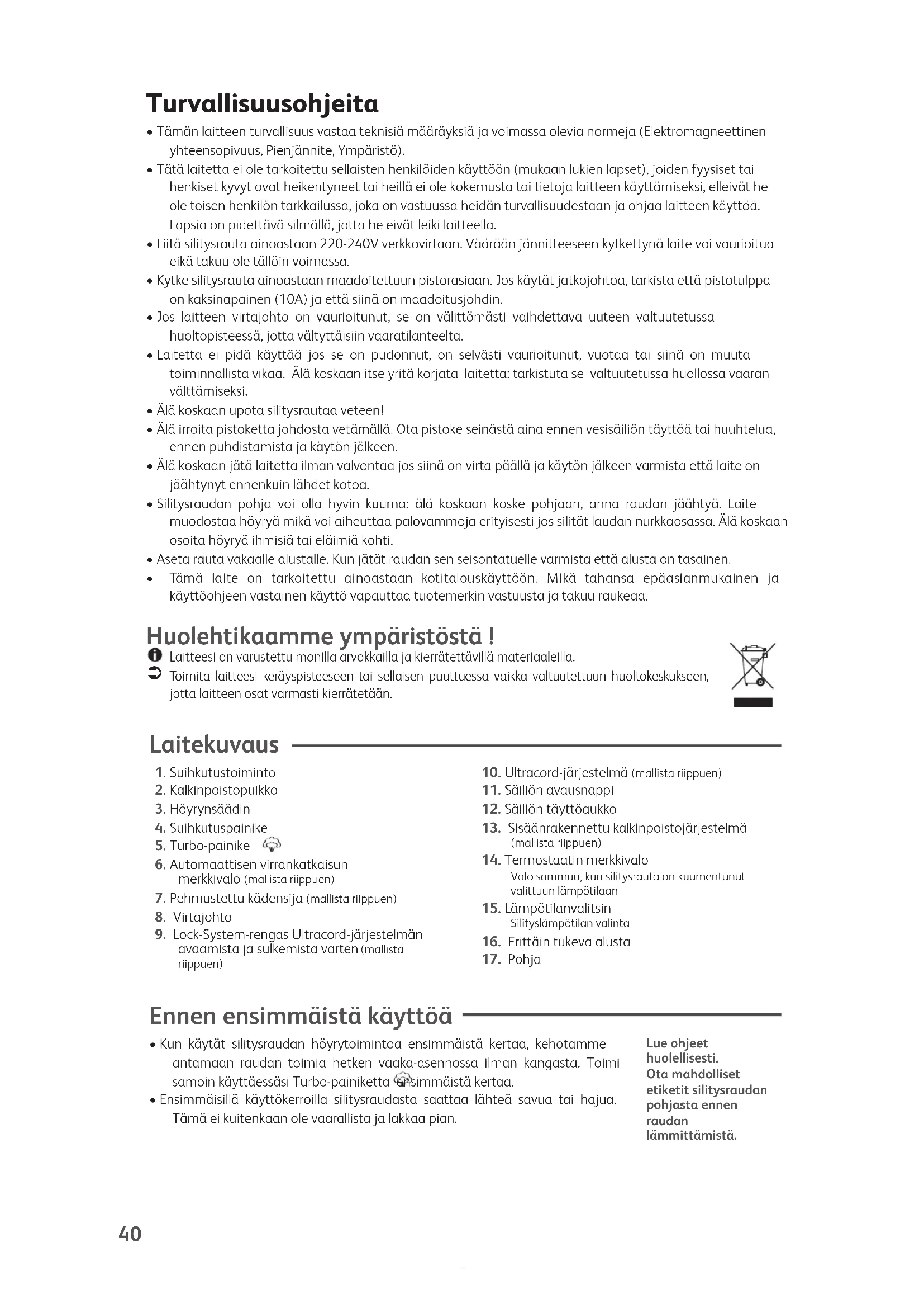 - Tämä laite on tarkoitettu ainoastaan kotitalouskäyttöön. Mikä tahansa epäasianmukainen ja käyttöohjeen vastainen käyttö vapauttaa tuotemerkin vastuusta ja takuu raukeaa. Huolehtikaamme ympäristöstä ! Laitteesi on varustettu monilla arvokkailla ja kierrätettävillä materiaaleilla.