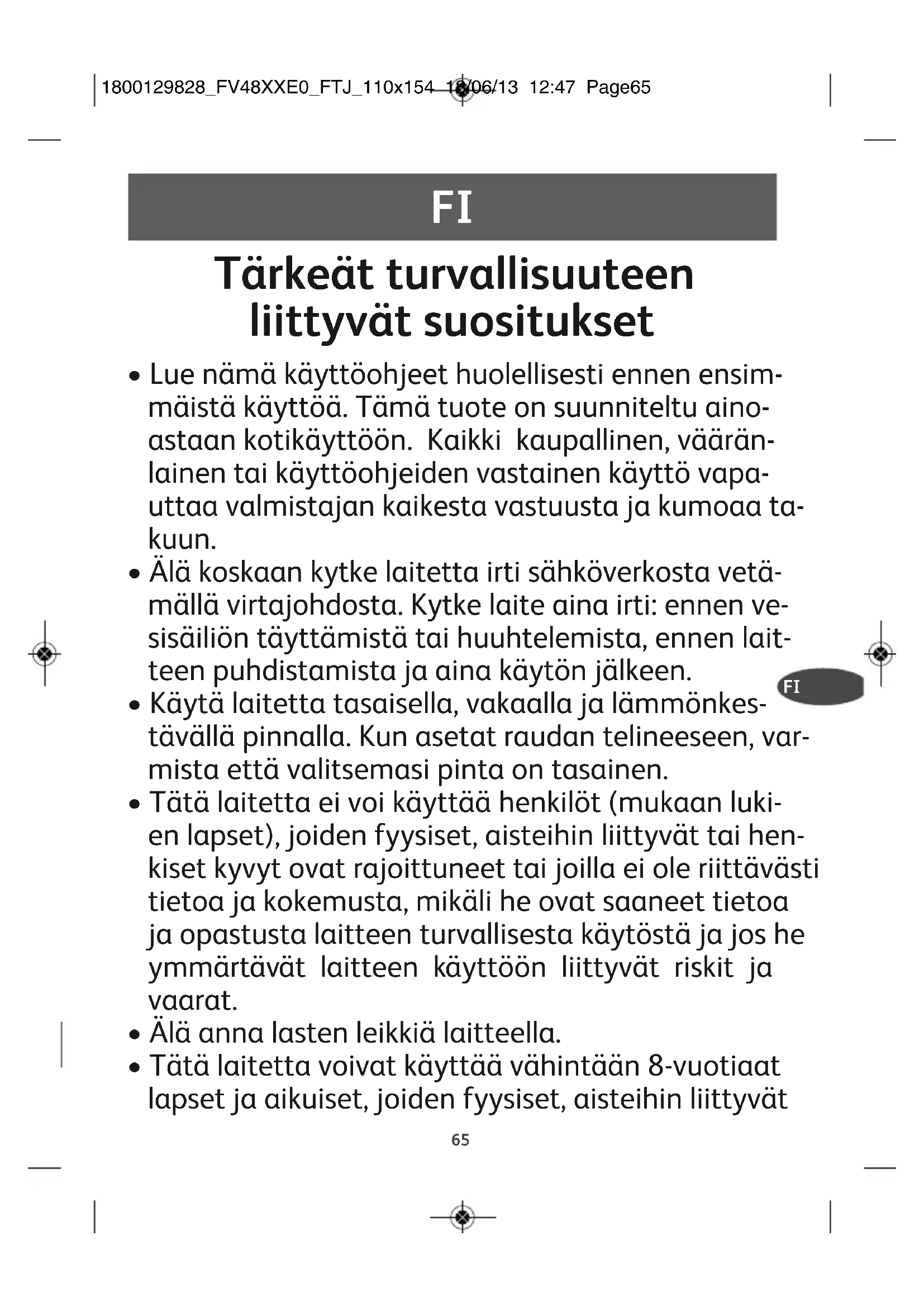 - Tätä laitetta voivat käyttää vähintään 8-vuotiaat lapset ja aikuiset, joiden fyysiset, aisteihin liittyvät 1800129828_FV48XXE0_FTJ_110x154 18/06/13 12:47 Page6566 tai henkiset kyvyt ovat rajoittuneet tai joilla ei ole riittävästi tietoa ja kokemusta, mikäli he ovat saa- neet tietoa ja opastusta laitteen turvallisesta käy- töstä ja jos he ymmärtävät laitteen käyttöön liit- tyvät riskit ja vaarat. Lapset eivät saa leikkiä lait- teella. Lapset eivät saa tehdä käyttäjälle sallittua puhdistusta ja huoltoa, paitsi jos he ovat yli 8-vuo- tiaita ja valvonnan alaisia. Säilytä laite ja sen johto poissa alle 8-vuotiaiden las- ten ulottuvilta.