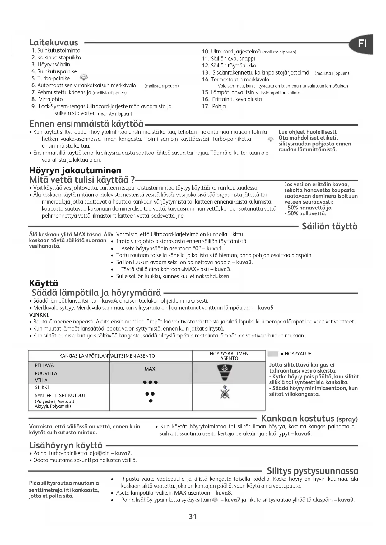 os vesi on erittäin kovaa, sekoita hanavettä kaupasta saatavaan demineralisoituun veteen seuraavasti: - 50% hanavettä ja - 50% pullovettä. Lue ohjeet huolellisesti. Ota mahdolliset etiketit silitysraudan pohjasta ennen raudan lämmittämistä. KANGAS LÄMPÖTILANVALITSIMEN ASENTOHÖYRYSÄÄTIMENASENTOPELLAVAPUUVILLAVILLASILKKISYNTEETTISET KUIDUT(Polyesteri, Asetaatti,Akryyli, Polyamidi) MAX
