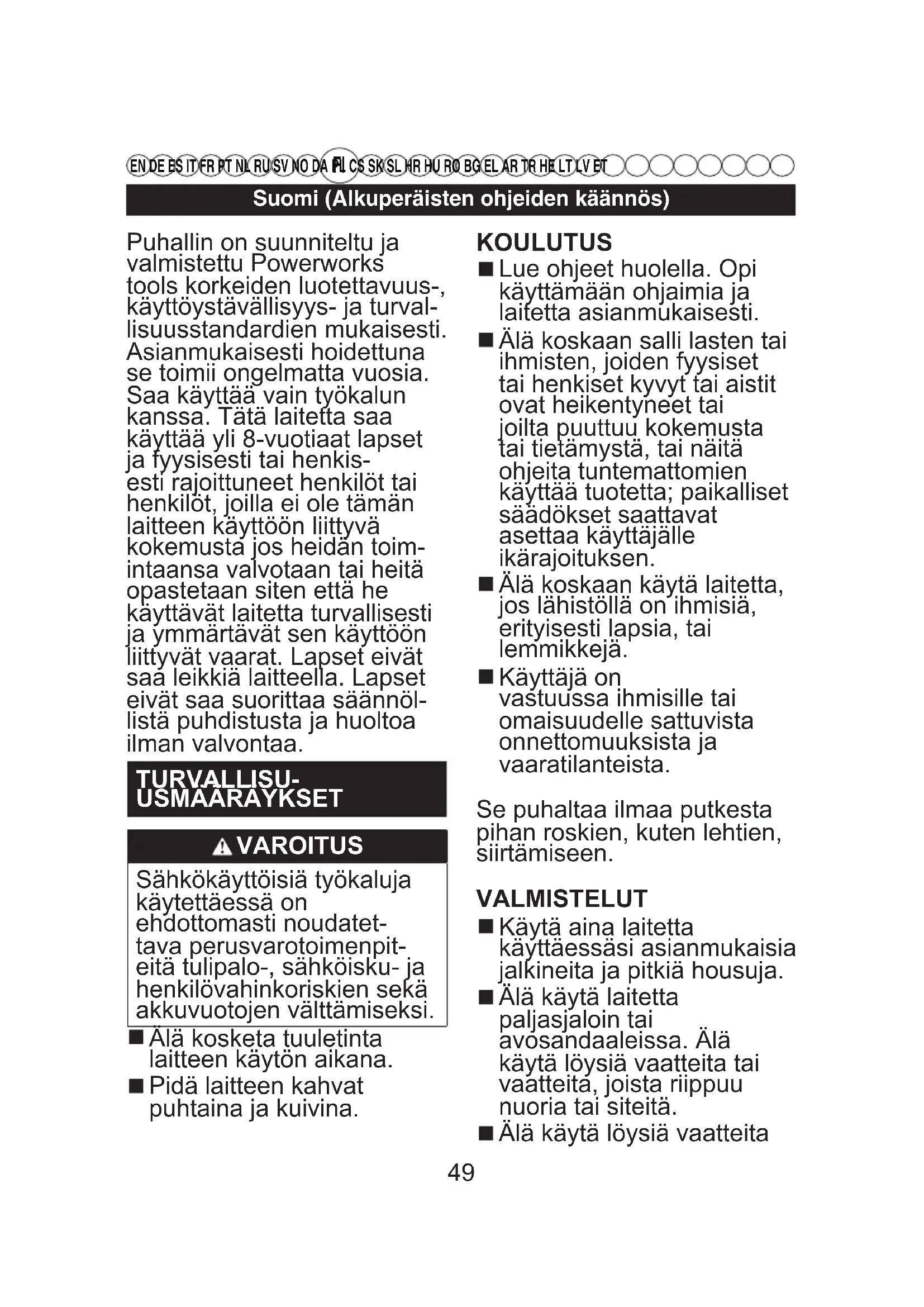 EN DE ES IT FR PT NL RU SV NO DA PL CS SK SL HR HU RO BG EL AR TR HE LT LV ET Puhallin on suunniteltu ja valmistettu Powerworks tools korkeiden luotettavuus-, käyttöystävällisyys- ja turval- lisuusstandardien mukaisesti. Asianmukaisesti hoidettuna se toimii ongelmatta vuosia. Saa käyttää vain työkalun kanssa. Tätä laitetta saa käyttää yli 8-vuotiaat lapset ja fyysisesti tai henkis- esti rajoittuneet henkilöt tai henkilöt, joilla ei ole tämän laitteen käyttöön liittyvä kokemusta jos heidän toim- intaansa valvotaan tai heitä opastetaan siten että he käyttävät laitetta turvallisesti ja ymmärtävät sen käyttöön liittyvät vaarat. Lapset eivät saa leikkiä laitteella. Lapset eivät saa suorittaa säännöl- listä puhdistusta ja huoltoa ilman valvontaa. TURVALLISU-