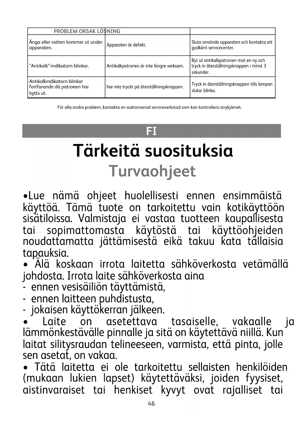 - Tätä laitetta voivat käyttää vähintään 8-vuotiaat lapset ja henkilöt, joilla ei ole riittävästi tietoa tai kokemusta tai joiden fyysiset, aistinvaraiset tai henkiset kyvyt ovat rajalliset tai heikentyneet, jos he ovat saaneet tarkat ohjeet laitteen käytössä, heitä valvotaan ja he ymmärtävät laitteen käyttöön liittyvät vaarat. Lapset eivät saa leikkiä laitteella. Lapset saavat tehdä käyttäjälle sallitun puhdistuksen ja huollon vain aikuisen valvonnassa. Pidä silitysrauta ja sen sähköjohto aina poissa alle 8-vuotiaiden lasten ulottuvilta, kun raudassa on virtaa tai rauta on jäähtymässä.