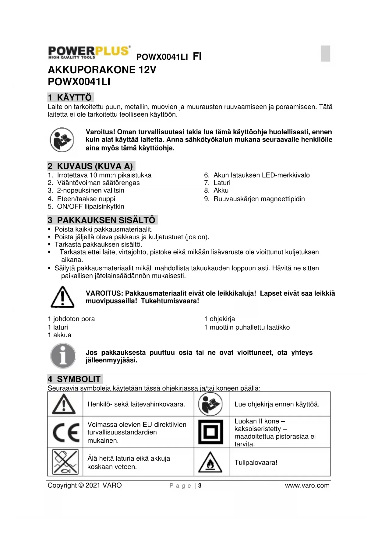 Copyright © 2021 VARO P a g e | 3 www.varo.com AKKUPORAKONE 12V POWX0041LI 1 KÄYTTÖ Laite on tarkoitettu puun, metallin, muovien ja muurausten ruuvaamiseen ja poraamiseen. Tätä laitetta ei ole tarkoitettu teolliseen käyttöön. Varoitus! Oman turvallisuutesi takia lue tämä käyttöohje huolellisesti, ennen kuin alat käyttää laitetta. Anna sähkötyökalun mukana seuraavalle henkilölle aina myös tämä käyttöohje. 2 KUVAUS (KUVA A)