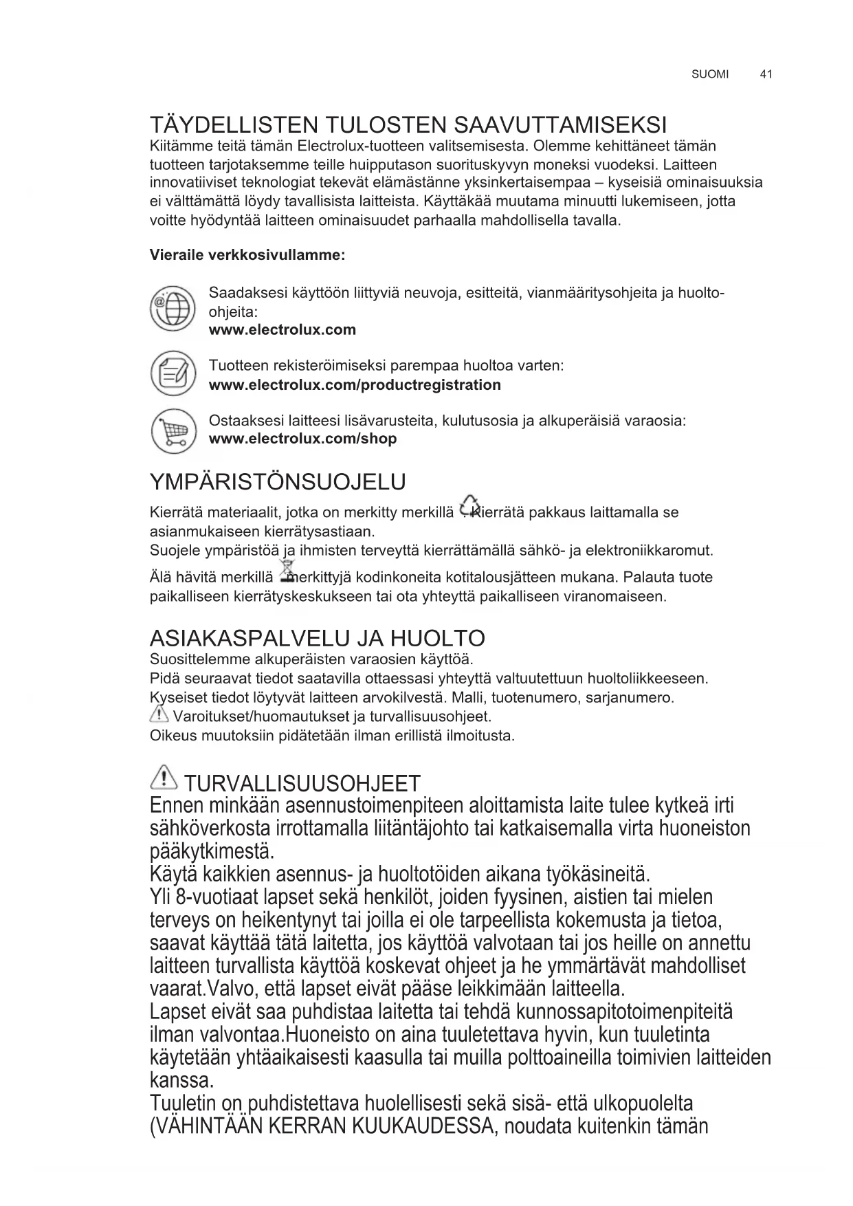 Kiitämme teitä tämän Electrolux-tuotteen valitsemisesta. Olemme kehittäneet tämän tuotteen tarjotaksemme teille huipputason suorituskyvyn moneksi vuodeksi Laitteen innovatiiviset teknologiat tekevät elämästänne yksinkertaisempaa – kyseisiä ominaisuuksia ei välttämättä löydy tavallisista laitteista. Käyttäkää muutama minuutti lukemiseen, jotta voitte hyödyntää laitteen ominaisuudet parhaalla mahdollisella tavalla. Vieraile verkkosivullamme: Saadaksesi käyttöön liittyviä neuvoja, esitteitä, vianmääritysohjeita ja huolto- ohjeita: www.electrolux.com Tuotteen rekisteröimiseksi parempaa huoltoa varten: www.electrolux.com/productregistration Ostaaksesi laitteesi lisävarusteita, kulutusosia ja alkuperäisiä varaosia: www.electrolux.com/shop