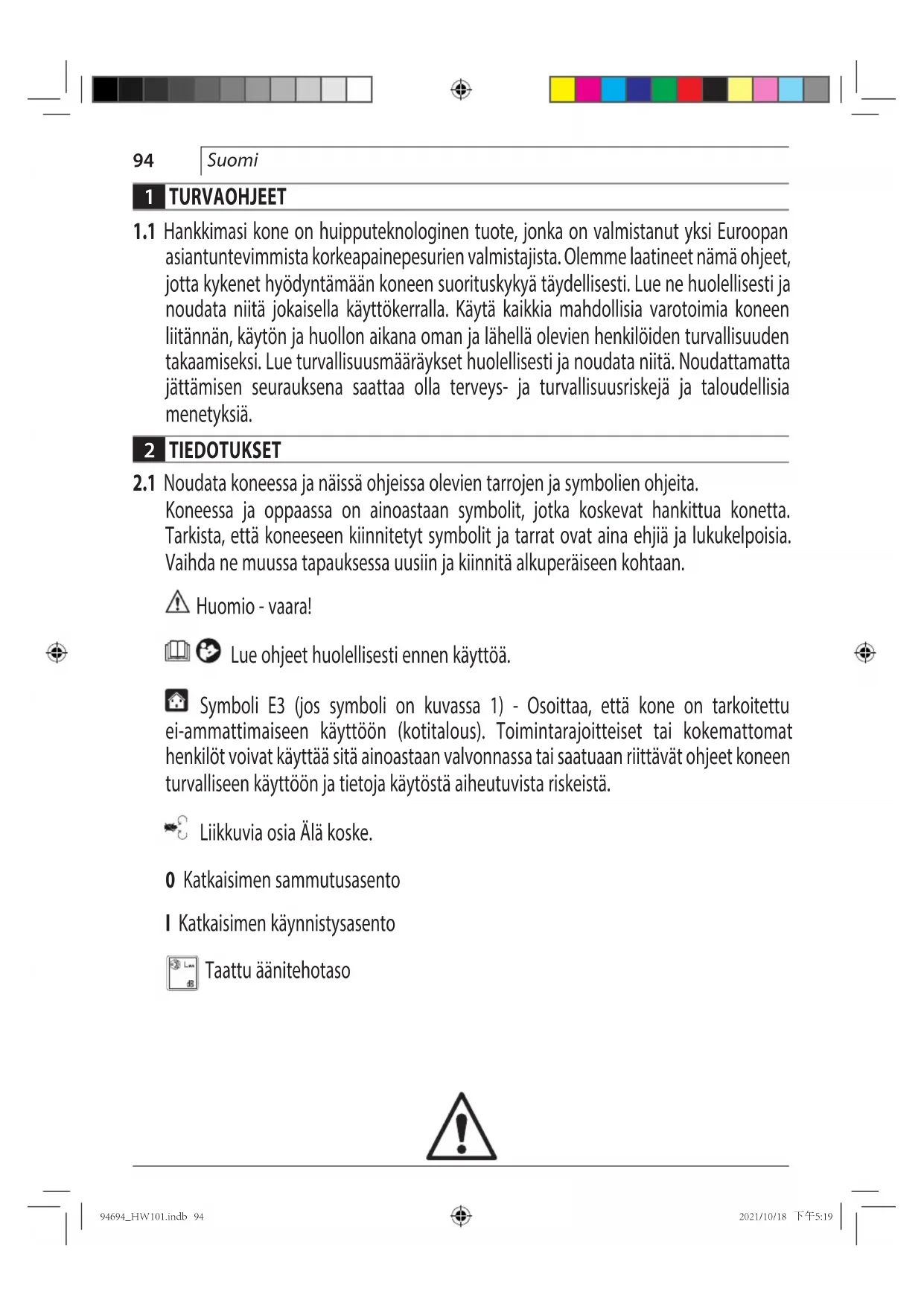 Koneessa ja oppaassa on ainoastaan symbolit, jotka koskevat hankittua konetta. Tarkista, että koneeseen kiinnitetyt symbolit ja tarrat ovat aina ehjiä ja lukukelpoisia. Vaihda ne muussa tapauksessa uusiin ja kiinnitä alkuperäiseen kohtaan. Huomio - vaara! Lue ohjeet huolellisesti ennen käyttöä. Symboli E3 (jos symboli on kuvassa 1) - Osoittaa, että kone on tarkoitettu ei-ammattimaiseen käyttöön (kotitalous). Toimintarajoitteiset tai kokemattomat henkilöt voivat käyttää sitä ainoastaan valvonnassa tai saatuaan riittävät ohjeet koneen turvalliseen käyttöön ja tietoja käytöstä aiheutuvista riskeistä. Liikkuvia osia Älä koske. 0 Katkaisimen sammutusasento I Katkaisimen käynnistysasento Taattu äänitehotaso 94694_HW101.indb 9494694_HW101.indb 94 2021/10/18 下午5:192021/10/18 下午5:1995 Suomi Kielto, joka varoittaa käyttäjää, että kansalliset määräykset saattavat kieltää koneen liitännän juomavesiverkkoon. Varoitusmerkki, joka varoittaa käyttäjää suuntaamasta vesisuihkua ihmisiä, eläimiä, sähkölaitteita tai konetta kohti. Tämän koneen eristysluokka on II. Se tarkoittaa, että kone on varustettu vahvistetulla tai kaksoiseristyksellä (ainoastaan jos symboli on koneessa). Tämä kone on soveltuvien eurooppalaisten direktiivien mukainen. Symboli E1 - Osoittaa, että konetta ei saa hävittää kotitalousjätteiden seassa. Se voidaan palauttaa jälleenmyyjälle hankittaessa uusi kone. Koneen sähkö- ja elektroniikkaosia ei tule käyttää uudelleen sopimattomiin tarkoituksiin, sillä ne sisältävät terveydelle haitallisia aineita. Koskee vain EU-maita Käytetyillä sähkö- ja elektroniikkalaitteilla voi olla negatiivisia ympäristö- ja terveysvaikutuksia niissä käytettyjen haitallisten osien takia. Älä hävitä sähkö- ja elektroniikkalaitteita kotitalousjätteen mukana! Vanhoja sähkö- ja elektroniikkalaitteita koskevan EU-direktiivin ja sen perusteella laadittujen kansallisten lakien mukaan käytetyt sähkö- ja elektroniikkalaitteet on kierrätettävä toimittamalla ne erilliseen, ympäristönsuojelusäädösten mukaisesti toimivaan kierrätyspisteeseen. Tämä on ilmaistu laitteessa olevalla ylivedetyn roska-astian symbolilla. Käytä kuulosuojaimia. Käytä kasvonsuojainta. Käytä hengityssuojaimia. Käytä suojakäsineitä. Käytä turvajalkineita. Käytä suojavaatetusta. 94694_HW101.indb 9594694_HW101.indb 95 2021/10/18 下午5:192021/10/18 下午5:1996 Suomi