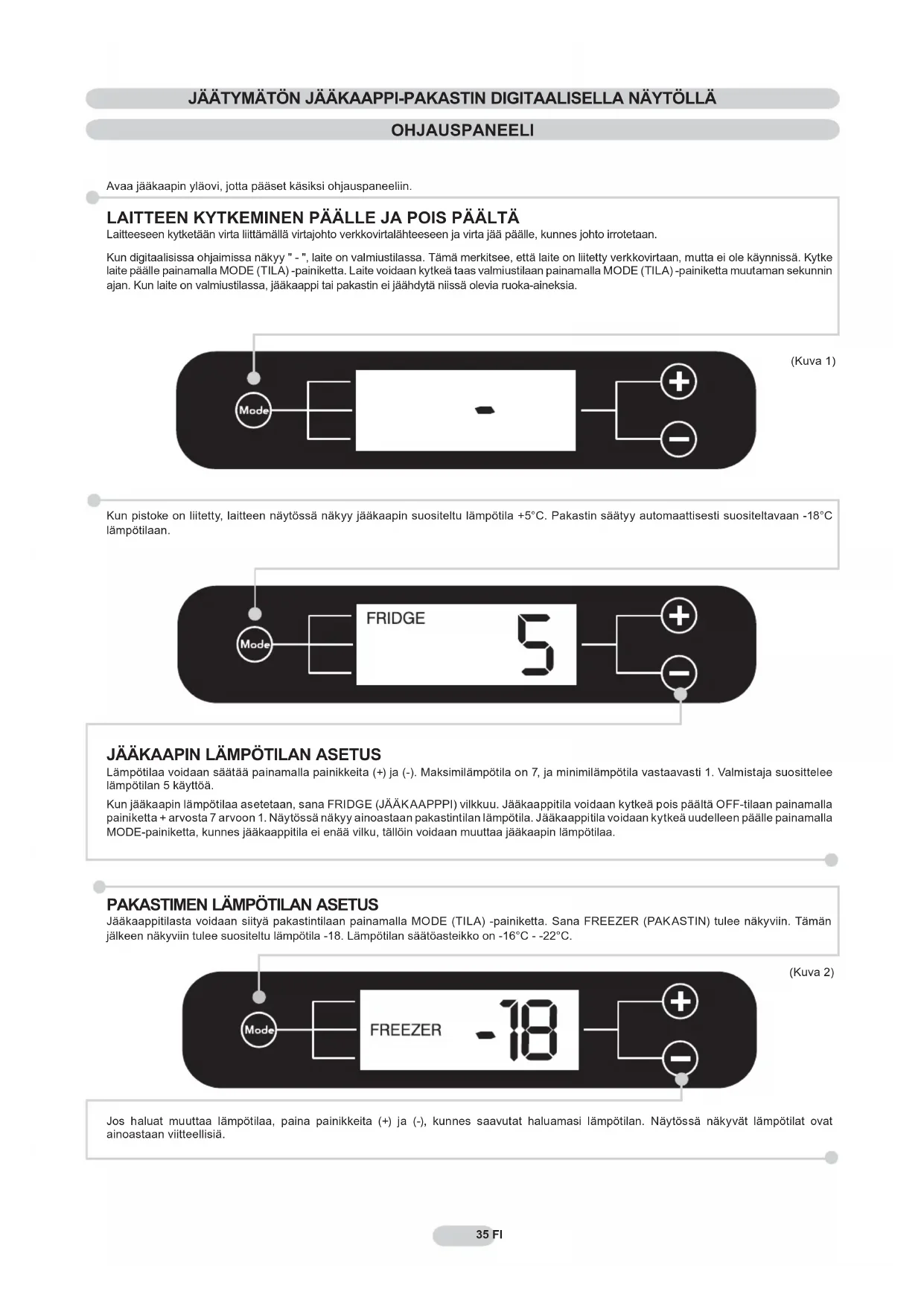 Jääkaappitilasta voidaan siityä pakastintilaan painamalla MODE (TILA) -painiketta. Sana FREEZER (PAKASTIN) tulee näkyviin. Tämän jälkeen näkyviin tulee suositeltu lämpötila -18. Lämpötilan säätöasteikko on -16°C - -22°C. Jos haluat muuttaa lämpötilaa, paina painikkeita (+) ja (-), kunnes saavutat haluamasi lämpötilan. Näytössä näkyvät lämpötilat ovat ainoastaan viitteellisiä. (Kuva 1) (Kuva 2) 35 IT35 FI Kun pistoke on liitetty, laitteen näytössä näkyy jääkaapin suositeltu lämpötila +5°C. Pakastin säätyy automaattisesti suositeltavaan -18°C lämpötilaan.36 FI
