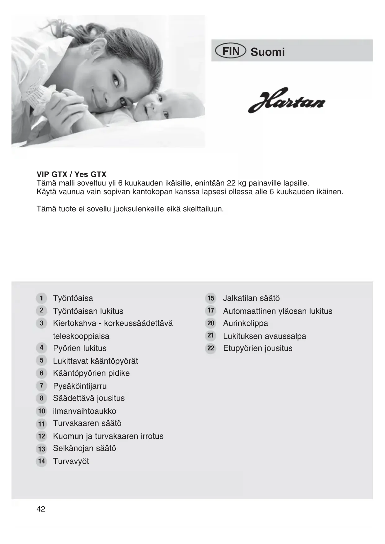 Lataa ohjeet laitteellesi Lastenrattaat PDF-muodossa ilmaiseksi! Löydä käyttöohjeesi Yes GTX - HARTAN ja ota elektroninen laitteesi takaisin hallintaan. Tällä sivulla julkaistaan kaikki laitteidesi käyttöön tarvittavat asiakirjat. Yes GTX merkiltä HARTAN.