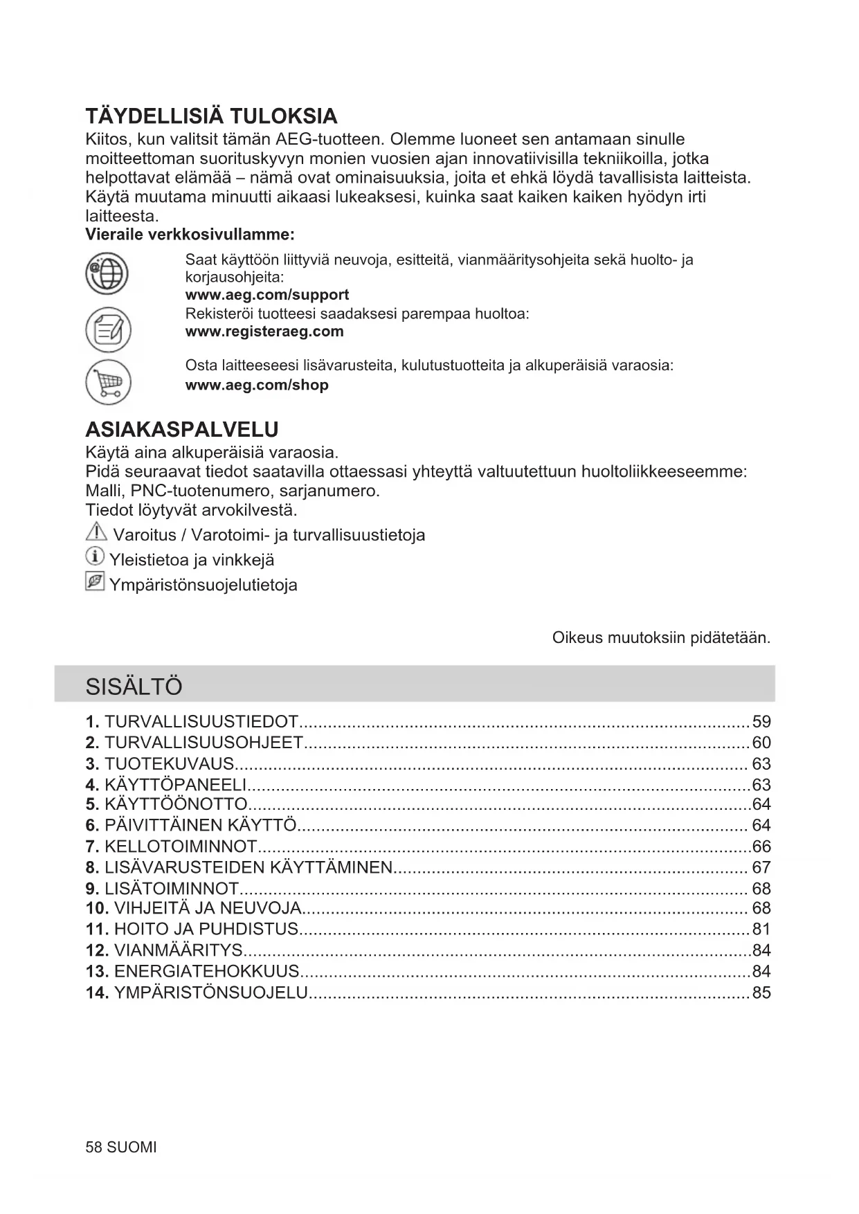 Kiitos, kun valitsit tämän AEG-tuotteen. Olemme luoneet sen antamaan sinulle moitteettoman suorituskyvyn monien vuosien ajan innovatiivisilla tekniikoilla, jotka helpottavat elämää – nämä ovat ominaisuuksia, joita et ehkä löydä tavallisista laitteista. Käytä muutama minuutti aikaasi lukeaksesi, kuinka saat kaiken kaiken hyödyn irti laitteesta. Vieraile verkkosivullamme: Saat käyttöön liittyviä neuvoja, esitteitä, vianmääritysohjeita sekä huolto- ja korjausohjeita: www.aeg.com/support Rekisteröi tuotteesi saadaksesi parempaa huoltoa: www.registeraeg.com Osta laitteeseesi lisävarusteita, kulutustuotteita ja alkuperäisiä varaosia: www.aeg.com/shop ASIAKASPALVELU Käytä aina alkuperäisiä varaosia. Pidä seuraavat tiedot saatavilla ottaessasi yhteyttä valtuutettuun huoltoliikkeeseemme: Malli, PNC-tuotenumero, sarjanumero. Tiedot löytyvät arvokilvestä. Varoitus / Varotoimi- ja turvallisuustietoja Yleistietoa ja vinkkejä Ympäristönsuojelutietoja Oikeus muutoksiin pidätetään. SISÄLTÖ