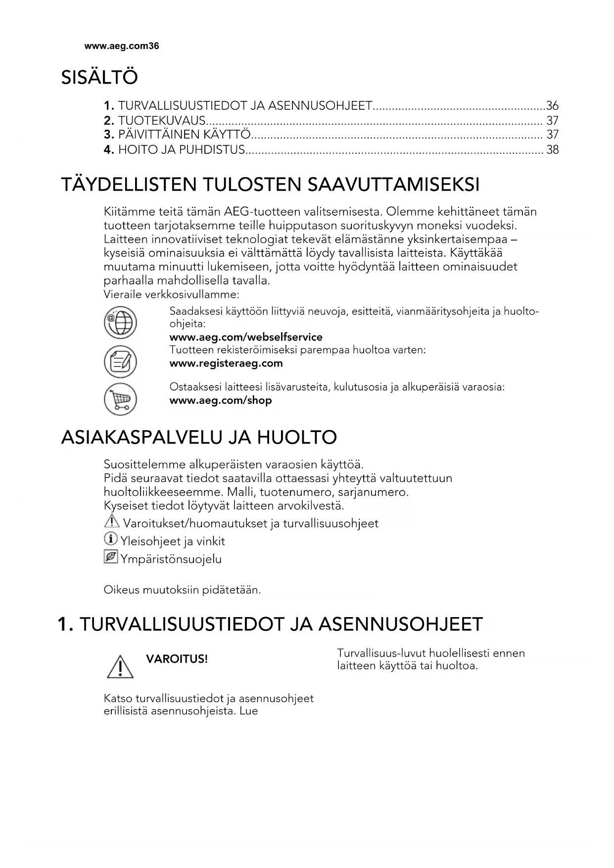 Kiitämme teitä tämän AEG-tuotteen valitsemisesta. Olemme kehittäneet tämän tuotteen tarjotaksemme teille huipputason suorituskyvyn moneksi vuodeksi. Laitteen innovatiiviset teknologiat tekevät elämästänne yksinkertaisempaa – kyseisiä ominaisuuksia ei välttämättä löydy tavallisista laitteista. Käyttäkää muutama minuutti lukemiseen, jotta voitte hyödyntää laitteen ominaisuudet parhaalla mahdollisella tavalla. Vieraile verkkosivullamme: Saadaksesi käyttöön liittyviä neuvoja, esitteitä, vianmääritysohjeita ja huolto- ohjeita: www.aeg.com/webselfservice Tuotteen rekisteröimiseksi parempaa huoltoa varten: www.registeraeg.com Ostaaksesi laitteesi lisävarusteita, kulutusosia ja alkuperäisiä varaosia: www.aeg.com/shop