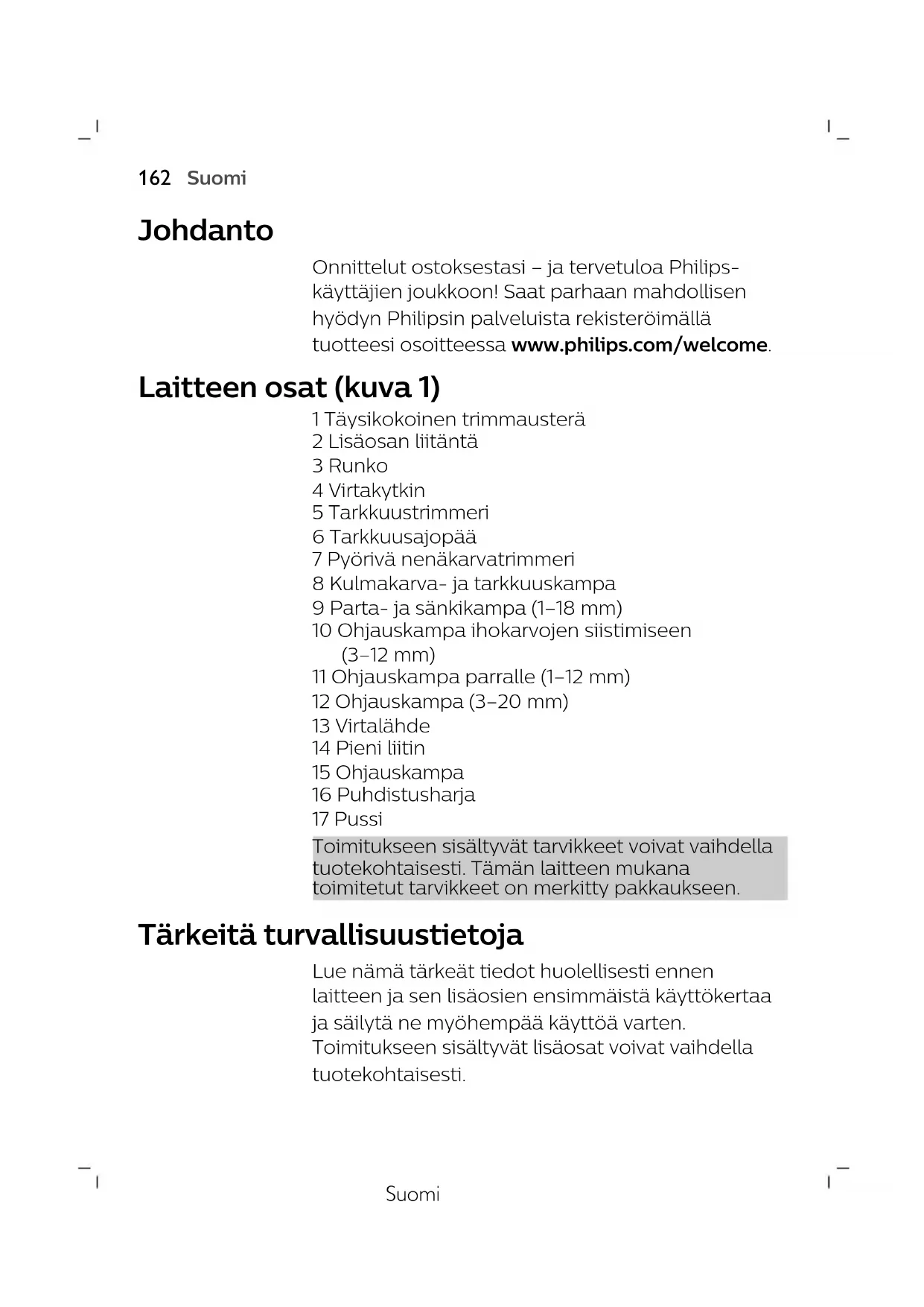 PortuguêsSuomi Johdanto Onnittelut ostoksestasi – ja tervetuloa Philips- käyttäjien joukkoon! Saat parhaan mahdollisen hyödyn Philipsin palveluista rekisteröimällä tuotteesi osoitteessa www.philips.com/welcome. Laitteen osat (kuva 1) 1 Täysikokoinen trimmausterä 2 Lisäosan liitäntä 3 Runko 4 Virtakytkin 5 Tarkkuustrimmeri 6 Tarkkuusajopää 7 Pyörivä nenäkarvatrimmeri 8 Kulmakarva- ja tarkkuuskampa 9 Parta- ja sänkikampa (1–18mm) 10 Ohjauskampa ihokarvojen siistimiseen (3–12mm) 11 Ohjauskampa parralle (1–12mm) 12 Ohjauskampa (3–20mm) 13 Virtalähde 14 Pieni liitin 15 Ohjauskampa 16 Puhdistusharja 17 Pussi Toimitukseen sisältyvät tarvikkeet voivat vaihdella tuotekohtaisesti. Tämän laitteen mukana toimitetut tarvikkeet on merkitty pakkaukseen. Tärkeitä turvallisuustietoja Lue nämä tärkeät tiedot huolellisesti ennen laitteen ja sen lisäosien ensimmäistä käyttökertaa ja säilytä ne myöhempää käyttöä varten. Toimitukseen sisältyvät lisäosat voivat vaihdella tuotekohtaisesti.