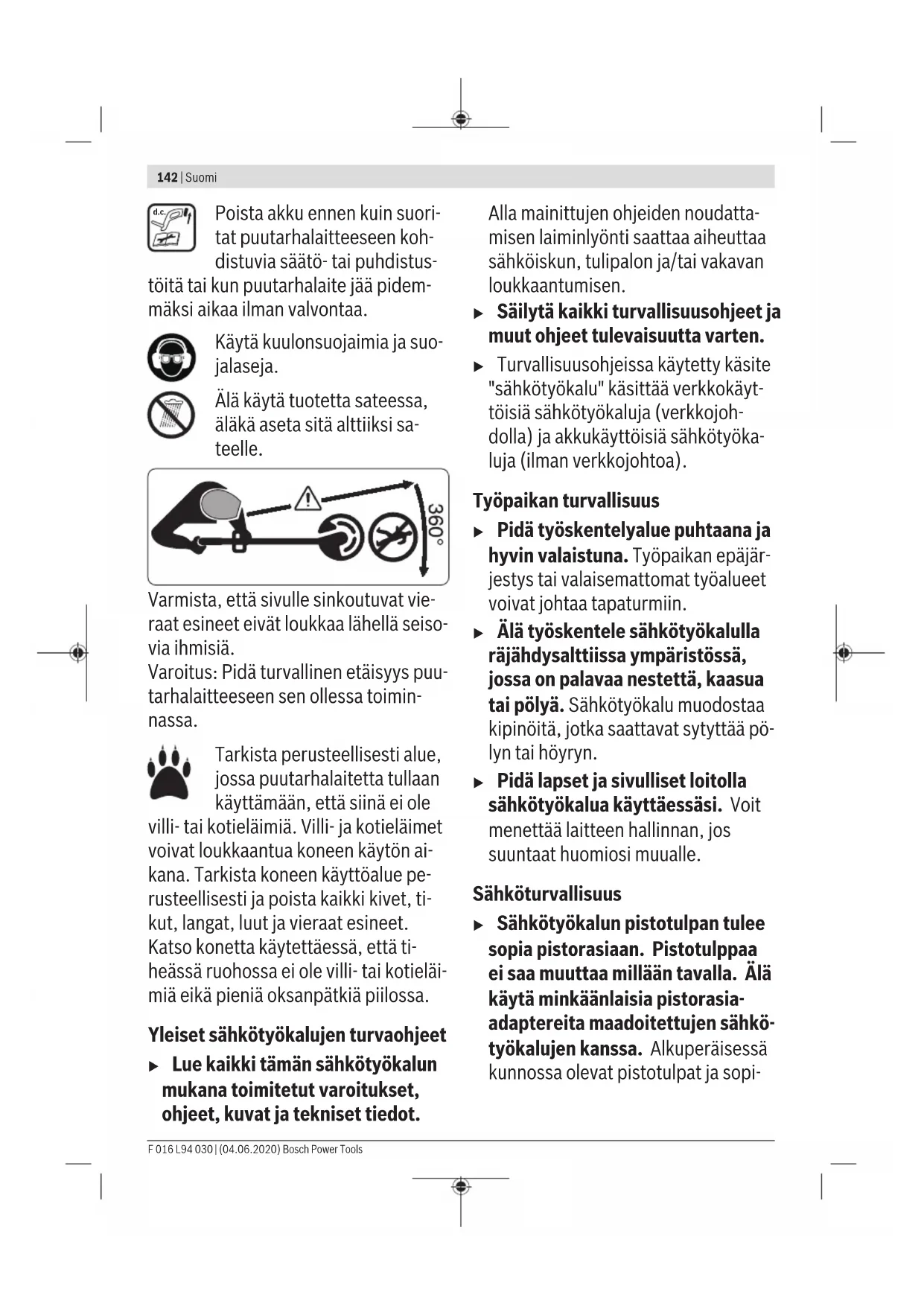 a.c. Ei sopiva. Bosch Power Tools F 016 L94 030 | (04.06.2020)142 | Suomi d.c. Poista akku ennen kuin suori- tat puutarhalaitteeseen koh- distuvia säätö- tai puhdistus- töitä tai kun puutarhalaite jää pidem- mäksi aikaa ilman valvontaa. Käytä kuulonsuojaimia ja suo- jalaseja. Älä käytä tuotetta sateessa, äläkä aseta sitä alttiiksi sa- teelle. Varmista, että sivulle sinkoutuvat vie- raat esineet eivät loukkaa lähellä seiso- via ihmisiä. Varoitus: Pidä turvallinen etäisyys puu- tarhalaitteeseen sen ollessa toimin- nassa. Tarkista perusteellisesti alue, jossa puutarhalaitetta tullaan käyttämään, että siinä ei ole villi- tai kotieläimiä. Villi- ja kotieläimet voivat loukkaantua koneen käytön ai- kana. Tarkista koneen käyttöalue pe- rusteellisesti ja poista kaikki kivet, ti- kut, langat, luut ja vieraat esineet. Katso konetta käytettäessä, että ti- heässä ruohossa ei ole villi- tai kotieläi- miä eikä pieniä oksanpätkiä piilossa. Yleiset sähkötyökalujen turvaohjeet u Lue kaikki tämän sähkötyökalun mukana toimitetut varoitukset, ohjeet, kuvat ja tekniset tiedot. Alla mainittujen ohjeiden noudatta- misen laiminlyönti saattaa aiheuttaa sähköiskun, tulipalon ja/tai vakavan loukkaantumisen. u Säilytä kaikki turvallisuusohjeet ja muut ohjeet tulevaisuutta varten. u Turvallisuusohjeissa käytetty käsite "sähkötyökalu" käsittää verkkokäyt- töisiä sähkötyökaluja (verkkojoh- dolla) ja akkukäyttöisiä sähkötyöka- luja (ilman verkkojohtoa). Työpaikan turvallisuus u Pidä työskentelyalue puhtaana ja hyvin valaistuna. Työpaikan epäjär- jestys tai valaisemattomat työalueet voivat johtaa tapaturmiin. u Älä työskentele sähkötyökalulla räjähdysalttiissa ympäristössä, jossa on palavaa nestettä, kaasua tai pölyä. Sähkötyökalu muodostaa kipinöitä, jotka saattavat sytyttää pö- lyn tai höyryn. u Pidä lapset ja sivulliset loitolla sähkötyökalua käyttäessäsi. Voit menettää laitteen hallinnan, jos suuntaat huomiosi muualle. Sähköturvallisuus u Sähkötyökalun pistotulpan tulee sopia pistorasiaan. Pistotulppaa ei saa muuttaa millään tavalla. Älä käytä minkäänlaisia pistorasia- adaptereita maadoitettujen sähkö- työkalujen kanssa. Alkuperäisessä kunnossa olevat pistotulpat ja sopi- F 016 L94 030 | (04.06.2020) Bosch Power ToolsSuomi | 143 vat pistorasiat vähentävät sähköis- kun vaaraa. u Vältä maadoitettujen pintojen, ku- ten putkien, pattereiden, liesien tai jääkaappien koskettamista. Sähköiskun vaara kasvaa, jos kehosi on maadoitettu. u Älä altista sähkötyökalua sateelle tai kosteudelle. Veden pääsy säh- kötyökalun sisään kasvattaa sähköis- kun riskiä. u Älä käytä verkkojohtoa väärin. Älä käytä johtoa sähkötyökalun kanta- miseen, ripustamiseen tai pistotul- pan irrottamiseen pistorasiasta vetämällä. Pidä johto loitolla kuu- muudesta, öljystä, terävistä reu- noista ja liikkuvista osista. Vahin- goittuneet tai sotkeutuneet johdot kasvattavat sähköiskun vaaraa. u Käyttäessäsi sähkötyökalua ul- kona käytä ainoastaan ulkokäyt- töön soveltuvaa jatkojohtoa. Ulko- käyttöön soveltuvan jatkojohdon käyttö pienentää sähköiskun vaaraa. u Jos sähkötyökalua on pakko käyt- tää kosteassa ympäristössä, on käytettävä vikavirtasuojakyt- kintä. Vikavirtasuojakytkimen käyttö vähentää sähköiskun vaaraa. Henkilöturvallisuus u Ole valpas, kiinnitä huomiota työs- kentelyysi ja noudata tervettä jär- keä sähkötyökalua käyttäessäsi. Älä käytä mitään sähkötyökalua, jos olet väsynyt tai huumeiden, al- koholin tai lääkkeiden vaikutuksen alaisena. Hetken tarkkaamattomuus sähkötyökalua käytettäessä saattaa johtaa vakavaan loukkaantumiseen. u Käytä henkilökohtaisia suojava- rusteita. Käytä aina suojalaseja. Henkilökohtaisen suojavarustuksen (esim. pölynaamari, luistamattomat turvajalkineet, suojakypärä tai kuu- lonsuojaimet kulloisenkin tehtävän mukaan) käyttö vähentää loukkaan- tumisriskiä. u Estä tahaton käynnistyminen. Varmista, että käynnistyskytkin on kytketty pois päältä ennen kuin yhdistät työkalun sähköverkkoon ja/tai akkuun, otat työkalun kä- teen tai kannat sitä. Jos kannat sähkötyökalua sormi käynnistyskyt- kimellä tai kytket sähkötyökalun pis- totulpan pistorasiaan käynnistyskyt- kimen ollessa käyntiasennossa, altis- tat itsesi onnettomuuksille. u Poista mahdollinen säätötyökalu tai kiinnitysavain ennen kuin käyn- nistät sähkötyökalun. Kiinnitysa- vain tai säätötyökalu, joka on unoh- dettu paikalleen sähkötyökalun pyö- rivään osaan, saattaa aiheuttaa tapa- turman. u Vältä kurkottelua. Huolehdi aina tukevasta seisoma-asennosta ja tasapainosta. Näin pystyt parem- min hallitsemaan sähkötyökalun odottamattomissa tilanteissa. u Käytä tarkoitukseen soveltuvia vaatteita. Älä käytä löysiä työ- Bosch Power Tools F 016 L94 030 | (04.06.2020)144 | Suomi vaatteita tai koruja. Pidä hiukset ja vaatteet poissa liikkuvien osien ulottuvilta. Väljät vaatteet, korut ja pitkät hiukset voivat takertua liikku- viin osiin. u Jos laitteissa on pölynpoistolii- täntä, varmista, että se on kyt- ketty oikein ja toimii kunnolla. Pö- lynpoistojärjestelmän käyttö vähen- tää pölyn aiheuttamia vaaroja. u Työskentele keskittyneesti ja nou- data aina turvallisuusmääräyksiä. Hetkellinenkin huolimattomuus voi aiheuttaa vakavia vammoja. Sähkötyökalun käyttö ja huolto u Älä ylikuormita laitetta. Käytä ky- seiseen työhön tarkoitettua sähkö- työkalua. Sopivan tehoisella sähkö- työkalulla teet työt paremmin ja tur- vallisemmin. u Älä käytä sähkötyökalua, jota ei voida käynnistää ja pysäyttää käynnistyskytkimestä. Sähkötyö- kalu, jota ei voi enää hallita käynnis- tyskytkimellä, on vaarallinen ja täy- tyy korjauttaa. u Irrota pistotulppa pistorasiasta ja/ tai irrota akku (jos irrotettava) sähkötyök